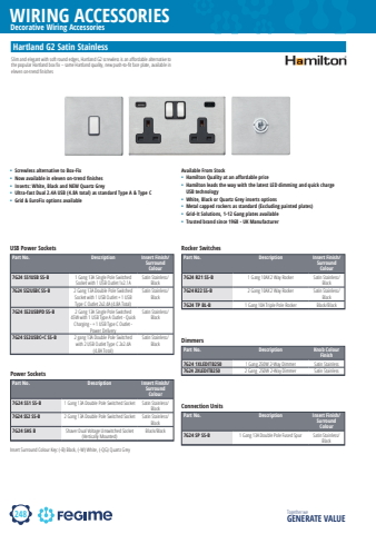 248WIRING ACCESSORIESTogether we GENERATE VALUEDecorative Wiring AccessorieshamiltonPart No. Description Insert Finish/Surround Colour7G24 SS1 SS-B 1 Gang 13A Double Pole Switched Socket Satin Stainless/Black7G24 SS2 SS-B 2 Gang 13A Double Pole Switched Socket Satin Stainless/Black7G24 SHS B Shaver Dual Voltage Unswitched Socket (Vertically Mounted)Black/BlackPart No. Description Insert Finish/Surround Colour7G24 SS1USB SS-B 1 Gang 13A Single Pole Switched Socket with 1 USB Outlet 1x2.1ASatin Stainless/Black7G24 SS2USBC SS-B 2 Gang 13A Double Pole Switched Socket with 1 USB Outlet + 1 USB Type C Outlet 2x2.4A (4.8A Total)Satin Stainless/Black7G24 SS2USBPD SS-B 2 Gang 13A Single Pole Switched 45W with 1 USB Type A Outlet - Quick Charging - + 1 USB Type C Outlet - Power DeliverySatin Stainless/Black7G24 SS2USBC+C SS-B 2 gang 13A Double Pole Switched with 2 USB Outlet Type C 2x2.4A (4.8A Total)Satin Stainless/BlackPart No. Description Knob Colour Finish7G24 1XLEDITB250 1 Gang 250W 2-Way Dimmer Satin Stainless7G24 2XLEDITB250 2 Gang 250W 2-Way Dimmer Satin StainlessPart No. Description Insert Finish/Surround Colour7G24 SP SS-B 1 Gang 13A Double Pole Fused Spur Satin Stainless/BlackPart No. Description Insert Finish/Surround Colour7G24 R21 SS-B 1 Gang 10AX 2 Way Rocker Satin Stainless/Black7G24 R22 SS-B 2 Gang 10AX 2 Way Rocker Satin Stainless/Black7G24 TP BL-B 1 Gang 10A Triple Pole Rocker Black/BlackHartland G2 Satin Stainless Power SocketsUSB Power SocketsDimmersConnection UnitsRocker SwitchesInsert Surround Colour Key: (-B) Black, (-W) White, (-QG) Quartz Grey%u2022 Screwless alternative to Box-Fix%u2022 Now available in eleven on-trend finishes%u2022 Inserts: White, Black and NEW Quartz Grey%u2022 Ultra-fast Dual 2.4A USB (4.8A total) as standard Type A & Type C%u2022 Grid & EuroFix options availableSlim and elegant with soft round edges, Hartland G2 screwless is an aff ordable alternative to the popular Hartland box fi x %u2013 same Hartland quality, new push-to-fi t face plate, available in eleven on-trend fi nishesAvailable From Stock %u2022 Hamilton Quality at an affordable price%u2022 Hamilton leads the way with the latest LED dimming and quick charge USB technology%u2022 White, Black or Quartz Grey inserts options%u2022 Metal capped rockers as standard (Excluding painted plates)%u2022 Grid-It Solutions, 1-12 Gang plates available %u2022 Trusted brand since 1968 - UK Manufacturer