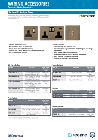 249WIRING ACCESSORIESTogether we GENERATE VALUEDecorative Wiring AccessorieshamiltonPart No. Description Insert Finish/Surround Colour7G29 SS1 AB-B 1 Gang 13A Double Pole Switched Socket Antique Brass/Black7G29 SS2 AB-B 2 Gang 13A Double Pole Switched Socket Antique Brass/Black7G29 SHS B Shaver Dual Voltage Unswitched Socket (Vertically Mounted)Black/BlackPart No. Description Insert Finish/Surround Colour7G29 SS1USB AB-B 1 Gang 13A Single Pole Switched Socket with 1 USB Outlet 1x2.1AAntique Brass/Black7G29 SS2USBC AB-B 2 Gang 13A Double Pole Switched Socket with 1 USB Outlet + 1 USB Type C Outlet 2x2.4A (4.8A Total)Antique Brass/Black7G29 SS2USBPD AB-B 2 Gang 13A Single Pole Switched 45W with 1 USB Type A Outlet - Quick Charging - + 1 USB Type C Outlet - Power DeliveryAntique Brass/Black7G29 SS2USBC+C AB-B 2 gang 13A Double Pole Switched with 2 USB Outlet Type C 2x2.4A (4.8A Total)Antique Brass/Black Part No. Description Knob Colour Finish7G29 1XLEDITB250 1 Gang 250W 2-Way Dimmer Antique Brass7G29 2XLEDITB250 2 Gang 250W 2-Way Dimmer Antique BrassPart No. Description Insert Finish/Surround Colour7G29 SP AB-B 1 Gang 13A Double Pole Fused Spur Antique Brass/BlackPart No. Description Insert Finish/Surround Colour7G29 R21 AB-B 1 Gang 10AX 2 Way Rocker Antique Brass/Black7G29 R22 AB-B 2 Gang 10AX 2 Way Rocker Antique Brass/Black7G29 TP BL-B 1 Gang 10A Triple Pole Rocker Black/BlackHartland G2 Antique BrassPower SocketsUSB Power SocketsDimmersConnection UnitsRocker SwitchesInsert Surround Colour Key: (-B) Black, (-W) White, (-QG) Quartz Grey%u2022 Screwless alternative to Box-Fix%u2022 Now available in eleven on-trend finishes%u2022 Inserts: White, Black and NEW Quartz Grey%u2022 Ultra-fast Dual 2.4A USB (4.8A total) as standard Type A & Type C%u2022 Grid & EuroFix options availableSlim and elegant with soft round edges, Hartland G2 screwless is an aff ordable alternative to the popular Hartland box fi x %u2013 same Hartland quality, new push-to-fi t face plate, available in eleven on-trend fi nishesAvailable From Stock %u2022 Hamilton Quality at an affordable price%u2022 Hamilton leads the way with the latest LED dimming and quick charge USB technology%u2022 White, Black or Quartz Grey inserts options%u2022 Metal capped rockers as standard (Excluding painted plates)%u2022 Grid-It Solutions, 1-12 Gang plates available%u2022 Trusted brand since 1968 - UK Manufacturer