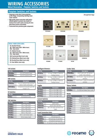 253WIRING ACCESSORIESTogether we GENERATE VALUEMetal Decorative - Flatplate Switches and SocketsFlatplate Switches and Sockets%u2022 Featuring an ultra slim 2.5mm projection profile design, incorporating matching metal rocker switches%u2022 High quality metal construction with built in moisture gasket to prevent any transfer of moisture from wall to plate ensuring the front plate finish remains untarnished%u2022 Constructed from premium grade componentsPart No. DescriptionFPR7000xx 13A 1G DP Switched SocketFPR9000xx 13A 2G DP Switched Socket13A SocketsPart No. DescriptionFPR9904xx 13A 2G SP Switched Socket with Dual USB A+C (5V DC 4.0A shared)FPR7USB4xx 13A Switched Socket with Quad USB Charger (5.1A)USB SocketsPart No. DescriptionFP2000xx 10A 1G 2-Way SwitchFP3000xx 10A 2G 2-Way SwitchFP4000xx 10A 3G 2-Way SwitchFP4100xx 10AX 4G 2-Way SwitchFP4200xx 10AX 6G 2-Way SwitchFP1200xx 10AX 1G Intermediate SwitchFP1100xx 10A Fan Isolator Switch10A SwitchesPart No. DescriptionFP2191xx 1G 2-way 10-200W (5-150W LED) Intelligent dimmerFP2192xx 2G 2-way 10-200W (5-150W LED) Intelligent dimmerFP2193xx 3G 2-way 10-200W (5-150W LED) Intelligent dimmerIntelligent DimmersPart No. DescriptionFP8341xx 20A DP SwitchFP8341Nxx 20A DP Switch with NeonFP8341Fxx 20A 1G DP Switch with Neon & Flex OutletControl SwitchesPart No. DescriptionFP6000xx 13A Fused Spur UnitFP6000Nxx 13A Fused Spur Unit with NeonFP6300xx 13A Switched Fused Spur UnitFP6300Nxx 13A Switched Fused Spur Unit with NeonFused Connection UnitsPart No. DescriptionFPR83MNxx 45A DP Switch with 13A Switched Socket + Neon IndicatorsFP81MNxx 45A DP Switch - Single Size with Neon IndicatorsFP82MNxx 45A DP Switch - Double Size with Neon IndicatorsCooker UnitsPart No. DescriptionFP8900xx 115/230V Dual Voltage Shaver SocketShaver SocketsPart No. DescriptionFP7300xx Telephone Master SocketFP7400xx Telephone Extension SocketFP0100xx 1G TV Outlet (non-isolated)FP8350xx 1G Blanking PlateFP8360xx 2G Blanking PlateFP1Gxx 1G Modular FaceplateFP2Gxx 2G Modular FaceplateFP4Gxx 4G Modular FaceplateMediaFPR7000GM FPR9940BBFP8900PLWFP7400PCFP2182BB FP6000NGMFP2000BCPart No. DescriptionFP5Axx 5A Unswitched Socket5A SwitchesPart No. DescriptionFP1TOGxx 10AX 1G 2-way Toggle SwitchFP2TOGxx 10AX 2G 2-way Toggle SwitchFP3TOGxx 10AX 3G 2-way Toggle SwitchFP4TOGxx 10AX 4G 2-way Toggle SwitchTogglesFINISH / INSERT SUFFIX CODES:%u2022 BC: Brushed Chrome (BC - Black Insert; BCW - White Insert; BCG - Grey Insert)%u2022 PC: Polished Chrome (PC - Black Insert; PCW - White Insert; PCG - Grey Insert)%u2022 GM: Gunmental (Black Insert only)%u2022 PB: Polished Brass (Black Insert only)%u2022 BB: Brushed Brass (Black Insert only)%u2022 PL: Pearl (White Insert only)FPR83MNPBFP0100FP1TOG