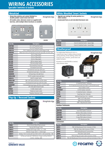255WIRING ACCESSORIESTogether we GENERATE VALUEMetalcladPart No. DescriptionMR7000 13A 1G DP Switched Socket MR9000 13A 2G DP Switched Socket MR9124 13A 1G Switched Socket with Dual USB Charger (2.4A)MR9940 Metal Clad 13A 2G SP Switched Socket with dual USB C+A 5V DC 4.0AM2000 10A 1G 2-Way Switch M3000 10A 2G 2-Way SwitchM4000 10A 3G 2-Way Switch M1100 10A Fan Isolator SwitchM1200 10A Intermediate SwitchM6000 13A Unswitched Fused SpurM6300 13A Switched Fused SpurM6300N 13A Switched Fused Spur with neonM6300F 13A Switched Fused Spur + Flex OutletM6000N 13A Fused Spur Unit with NeonM9LOCKN 13A DP Lockable Socket with NeonM8341L 20A DP Lockable SwitchM8341NF 20A 1G DP Switch with Neon and Flex OutletM6000F 13A Unswitched Fused Spur with Flex OutletM6000NF 13A Unswitched Fused Spur with Neon and Flex OutletMC6 UTP CAT6a RJ45 Network OutletMRJ45 1G RJ45 network outletM7300 Telephone master socketM7400 Telephone Extension socket%u2022 Heavy duty switches and sockets finished in a durable powder coated metal clad finish%u2022 All models unless otherwise stated are supplied with back box, with multiple 20mm knockouts as standardWhite Moulded Smart Sockets%u2022 Upgrade any existing 2G socket position to a Smart solution%u2022 Constructed from an anti-microbial thermoset resinPart No. DescriptionSN9KW Smart 2G Switched Socket - Square EdgeCU9KW Smart 2G Switched Socket - Curved EdgePop-Up / Recessed SocketsPart No. DescriptionSK006 IP54 3G Recess Mount Pop Up SocketSK0010 Pop Up USB Charger (2.4A)SK0012 Desktop USB Charger (4.0A ) - A + C USBSK0015 Wireless Charger with A + C USB ChargerSK0011 Desktop 13A 2G Socket with Dual USB-A (5V DC 2.4A shared) Max. 12WSK0016 13A Pop up Socket with 10W Wireless Charger and Dual USB A+C (12V DC 1.5A) Max. 30WMR9000 M6300NCU9KWSK0015Part No. DescriptionOP9N 2G Switched Socket + IndicatorsOP94 2G SP Switched Socket with Dual USB A+C [5V DC4.0A shared]OP9KW Smart Outdoor SocketOPRCDKIT 2G RCD Outdoor Socket KitOP7N 1G Switched Socket + Indicators OP6N Fused Spur Unit + Indicator OP63N Switched Fused Spur Unit + Indicator OP2 20AX 1G SP 2-Way SwitchOP3 20AX 2G SP 2-Way SwitchOP21 20AX 1-Way Retractive Switch The Knightsbridge Weatherproof series is a comprehensive range of outdoor wiring accessories covering switching, remote switching, sockets, RCD, Fused spur units, connectors, junction boxes and outdoor enclosures.All products are rated IP66/IK06 as standard, unless otherwise stated.OP3Specialist Switches & SocketsWeatherproofPart No. DescriptionJB007BK Small IP66 Outdoor Enclosure JB008BK Medium IP66 Outdoor Enclosure JB009BK Large IP66 Outdoor Enclosure JB0010BK X-Large IP66 Outdoor EnclosureJB55BK IP55 Weatherproof BoxOutdoor EnclosuresPart No. DescriptionJB002 IP68 16A Weatherproof Inline Connector (3 Pole)JB003 IP68 16A 3-Way Cable Connector (3-Pole)JB004 IP68 16A Weatherproof Connector BoxJB006 IP66 20mm Cable GlandsJB0011 IP68 16A Plug and Socket Cable Connector (3-Pole)JB0013 IP68 24A Weatherproof Inline Connector with lever terminals (3 Pole)ConnectorsOP9N