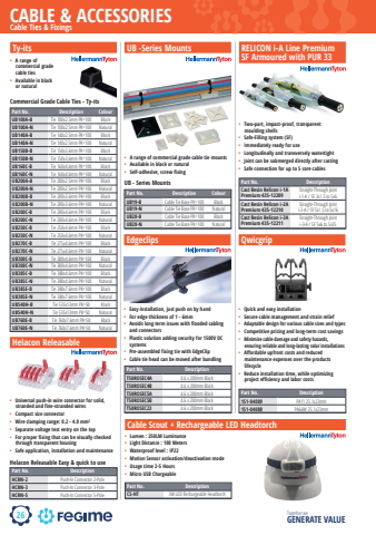 26CABLE & ACCESSORIESTogether we GENERATE VALUEPush in Connectorshellermanntyton hellermann tytonCable Ties & FixingsTy-its UB -Series MountsPart No. Description ColourUB100A-B Tie 100x2.5mm PK=100 BlackUB100A-N Tie 100x2.5mm PK=100 NaturalUB140A-B Tie 140x2.5mm PK=100 BlackUB140A-N Tie 140x2.5mm PK=100 NaturalUB150B-B Tie 150x3.6mm PK=100 BlackUB150B-N Tie 150x3.6mm PK=100 NaturalUB160C-B Tie 160x4.6mm PK=100 BlackUB160C-N Tie 160x4.6mm PK=100 NaturalUB200A-B Tie 200x2.5mm PK=100 BlackUB200A-N Tie 200x2.5mm PK=100 NaturalUB200B-B Tie 200x3.6mm PK=100 BlackUB200B-N Tie 200x3.6mm PK=100 NaturalUB200C-B Tie 200x4.6mm PK=100 BlackUB200C-N Tie 200x4.6mm PK=100 NaturalUB250C-B Tie 250x4.6mm PK=100 BlackUB250C-N Tie 250x4.6mm PK=100 NaturalUB270C-B Tie 275x4.6mm PK=100 BlackUB270C-N Tie 275x4.6mm PK=100 NaturalUB300C-B Tie 300x4.6mm PK=100 BlackUB300C-N Tie 300x4.6mm PK=100 NaturalUB385C-B Tie 380x4.6mm PK=100 BlackUB385C-N Tie 380x4.6mm PK=100 NaturalUB385E-B Tie 380x7.6mm PK=100 BlackUB385E-N Tie 380x7.6mm PK=100 NaturalUB540H-B Tie 535x13mm PK=50 BlackUB540H-N Tie 535x13mm PK=50 NaturalUB760E-B Tie 760x7.6mm PK=50 BlackUB760E-N Tie 760x7.6mm PK=50 NaturalPart No. Description ColourUB19-B Cable Tie Base PK=100 BlackUB19-N Cable Tie Base PK=100 NaturalUB28-B Cable Tie Base PK=100 BlackUB28-N Cable Tie Base PK=100 NaturalCommercial Grade Cable Ties - Ty-itsUB - Series Mounts%u2022 A range of commercial grade cable tie mounts%u2022 Available in black or natural%u2022 Self-adhesive, screw fixing%u2022 A range of commercial grade cable ties%u2022 Available in black or naturalPart No. DescriptionCast Resin Relicon i-1A Premium 435-12209Straight-Through Joint i-1-A / SF 3x1.5 to 5x6Cast Resin Relicon i-2A Premium 435-12210Straight-Through Joint i-2-A / SF 5x1.5 to 5x16Cast Resin Relicon i-3A Premium 435-12211Straight-Through Joint i-3-A / SF 5x6 to 5x35%u2022 Two-part, impact-proof, transparent moulding shells%u2022 Safe-Filling system (SF)%u2022 Immediately ready for use%u2022 Longitudinally and transversely watertight%u2022 Joint can be submerged directly after casting%u2022 Safe connection for up to 5 core cablesEdgeclips%u2022 Easy installation, just push on by hand%u2022 For edge thickness of 1 - 6mm%u2022 Avoids long term issues with flooded cabling and connectors%u2022 Plastic solution adding security for 1500V DC systems%u2022 Pre-assembled fixing tie with EdgeClip%u2022 Cable tie head can be moved after bundlingPart No. DescriptionT50ROSEC4A 4.6 x 200mm BlackT50ROSEC4B 4.6 x 200mm BlackT50ROSEC5A 4.6 x 200mm BlackT50ROSEC5B 4.6 x 200mm BlackT50ROSEC23 4.6 x 200mm BlackHelacon ReleasablePart No. DescriptionHCRN-2 Push-In Connector 2-PoleHCRN-3 Push-In Connector 3-PoleHCRN-5 Push-In Connector 5-PoleHelacon Releasable Easy & quick to use%u2022 Universal push-in wire connector for solid, stranded and fine-stranded wires%u2022 Compact size connector%u2022 Wire clamping range: 0.2 - 4.0 mm%u00b2%u2022 Separate voltage test entry on the top%u2022 For proper fixing that can be visually checked through transparent housing%u2022 Safe application, installation and maintenanceRELICON i-A Line Premium SF Armoured with PUR 33Qwicgrip%u2022 Quick and easy installation%u2022 Secure cable management and strain relief%u2022 Adaptable design for various cable sizes and types%u2022 Competitive pricing and long-term cost savings%u2022 Minimize cable damage and safety hazards, ensuring reliable and long-lasting solar installations%u2022 Affordable upfront costs and reduced maintenance expenses over the products lifecycle%u2022 Reduce installation time, while optimizing project efficiency and labor costsPart No. Description151-04089 PA11 25.1x23mm151-04088 PA66W 25.1x23mmCable Scout + Rechargeable LED Headtorch%u2022 Lumen : 250LM Luminance%u2022 Light Distance : 100 Meters%u2022 Waterproof level : IP22%u2022 Motion Sensor activation/deactivation mode%u2022 Usage time 2-5 Hours%u2022 Micro USB ChargeablePart No. DescriptionCS-HT 3W LED Rechargeable Headtorch