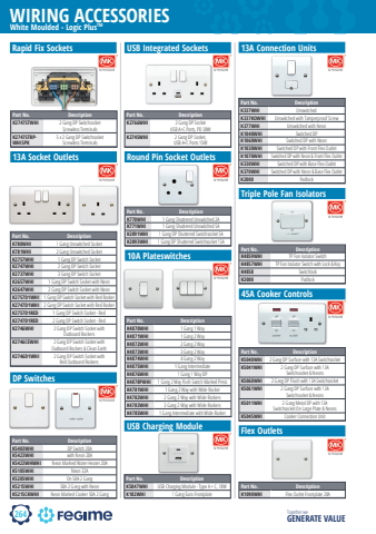 264WIRING ACCESSORIESTogether we GENERATE VALUEWhite Moulded - Logic PlusTMPart No. DescriptionK780WHI 1 Gang Unswitched SocketK781WHI 2 Gang Unswitched SocketK2757WHI 1 Gang DP Switch SocketK2747WHI 2 Gang DP Switch SocketK2737WHI 3 Gang DP Switch SocketK2657WHI 1 Gang DP Switch Socket with NeonK2647WHI 2 Gang DP Switch Socket with NeonK2757D1WHI 1 Gang DP Switch Socket with Red RockerK2747D1WHI 2 Gang DP Switch Socket with Red RockerK2757D1RED 1 Gang DP Switch Socket - RedK2747D1RED 2 Gang DP Switch Socket - RedK2746WHI 2 Gang DP Switch Socket withOutboard RockersK2746CEWHI 2 Gang DP Switch Socket withOutboard Rockers & Clean EarthK2746D1WHI 2 Gang DP Switch Socket withRed Outboard Rockers13A Socket Outlets Round Pin Socket OutletsTriple Pole Fan IsolatorsPart No. DescriptionK5847WHI USB Charging Module - Type A + C, 18WK182WHI 1 Gang Euro FrontplateUSB Charging ModulePart No. DescriptionK770WHI 1 Gang Shuttered Unswitched 2AK771WHI 1 Gang Shuttered Unswitched 5AK2891WHI 1 Gang DP Shuttered Switchsocket 5AK2893WHI 1 Gang DP Shuttered Switchsocket 15ADP SwitchesPart No. DescriptionK5403WHI DP Switch 20AK5423WHI with Neon 20AK5423WHWHI Neon Marked Water Heater 20AK5105WHI Neon 32AK5205WHI On 50A 2 GangK5215WHI 50A 2 Gang with NeonK5215CKWHI Neon Marked Cooker 50A 2 GangPart No. DescriptionK4859WHI TP Fan Isolator SwitchK4857WHI TP Fan Isolator Switch with Lock & KeyK4858 SwitchlockK2000 Padlock45A Cooker ControlsPart No. DescriptionK5040WHI 2 Gang DP Surface with 13A SwitchsocketK5041WHI 2 Gang DP Surface with 13ASwitchsocket & NeonsK5060WHI 2 Gang DP Flush with 13A SwitchsocketK5061WHI 2 Gang DP Surface with 13ASwitchsocket & NeonsK5011WHI 2 Gang Metal DP with 13ASwitchsocket On Large Plate & NeonsK5045WHI Cooker Connection UnitFlex OutletsPart No. DescriptionK1090WHI Flex Outlet Frontplate 20A13A Connection UnitsPart No. DescriptionK337WHI UnswitchedK337KOWHI Unswitched with Tamperproof ScrewK377WHI Unswitched with NeonK1040WHI Switched DPK1060WHI Switched DP with NeonK1030WHI Switched DP with Front Flex OutletK1070WHI Switched DP with Neon & Front Flex OutletK330WHI Switched DP with Base Flex OutletK370WHI Switched DP with Neon & Base Flex OutletK2000 PadlockPart No. DescriptionK4870WHI 1 Gang 1 WayK4871WHI 1 Gang 2 WayK4872WHI 2 Gang 2 WayK4873WHI 3 Gang 2 WayK4874WHI 4 Gang 2 WayK4875WHI 1 Gang IntermediateK4876WHI 1 Gang 1 Way DPK4878PWHI 1 Gang 2 Way Push Switch Marked PressK4781WHI 1 Gang 2 Way with Wide RockerK4782WHI 2 Gang 2 Way with Wide RockersK4783WHI 3 Gang 2 Way with Wide RockersK4785WHI 1 Gang Intermediate with Wide Rocker10A PlateswitchesPart No. DescriptionK2747STWHI 2 Gang DP Switchsocket Screwless TerminalsK2747STRPWHI5PK5 x 2 Gang DP Switchsocket Screwless TerminalsRapid Fix SocketsPart No. DescriptionK2766WHI 2 Gang DP Socket USB A+C Ports, PD 30WK2745WHI 2 Gang DP Socket, USB A+C Ports 15WUSB Integrated Sockets