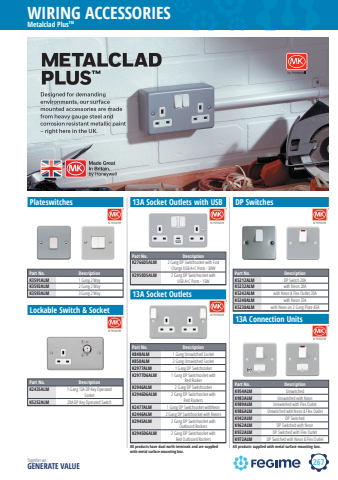267WIRING ACCESSORIESTogether we GENERATE VALUEmk metalclad plusMetalclad PlusTMPlateswitchesPart No. DescriptionK3591ALM 1 Gang 2 WayK3592ALM 2 Gang 2 WayK3593ALM 3 Gang 2 Way13A Socket Outlets with USBPart No. DescriptionK2766D5ALM 2 Gang DP Switchsocket with Fast Charge USB A+C Ports - 30WK2950D5ALM 2 Gang DP Switchsocket with USB A+C Ports - 15WDP SwitchesPart No. DescriptionK5212ALM DP Switch 20AK5232ALM with Neon 20AK5242ALM with Neon & Flex Outlet 20AK5240ALM with Neon 32AK5230ALM with Neon on 2 Gang Plate 45A13A Connection UnitsPart No. DescriptionK954ALM UnswitchedK983ALM Unswitched with NeonK989ALM Unswitched with Flex OutletK986ALM Unswitched with Neon & Flex OutletK942ALM DP SwitchedK962ALM DP Switched with NeonK932ALM DP Switched with Flex OutletK972ALM DP Switched with Neon & Flex OutletAll products have dual earth terminals and are supplied All products supplied with metal surface mounting box.with metal surface mounting box.Lockable Switch & SocketPart No. DescriptionK2435ALM 1 Gang 13A DP Key OperatedSocketK5252ALM 20A DP Key Operated SwitchPart No. DescriptionK848ALM 1 Gang Unswitched SocketK850ALM 2 Gang Unswitched SocketK2977ALM 1 Gang DP SwitchsocketK2977D6ALM 1 Gang DP Switchsocket withRed RockerK2946ALM 2 Gang DP SwitchsocketK2946D6ALM 2 Gang DP Switchsocket withRed RockersK2477ALM 1 Gang DP Switchsocket withNeonK2446ALM 2 Gang DP Switchsocket with NeonsK2945ALM 2 Gang DP Switchsocket withOutboard RockersK2945D6ALM 2 Gang DP Switchsocket withRed Outboard Rockers13A Socket Outlets