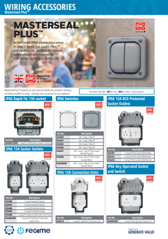 268WIRING ACCESSORIESTogether we GENERATE VALUEweatherproofmk masterseal plusMasterseal PlusTMIP66 SwitchesPart No. DescriptionK56400 10A 1 Gang 1 Way SPK56401 10A 1 Gang 2 Way SPK56402 10A 2 Gang 1 Way SPK56406 10A 1 Gang 1 Way DPK56407 10A 1 Gang 1 Way SP Push Switchwith Bell SymbolK56408 10A 1 Gang 2 Way SP Push Switchmarked PRESSK56409GRY 20A 1 Gang 1 Way SP Push Switchmarked PRESSIP66 13A Connection UnitsIP66 Rapid Fix 13A socketPart No. DescriptionK56410 1 Gang DP Switched Connection UnitPart No. DescriptionK56482STGRY 2 Gang DP Switchsocket Screwless TerminalsIP66 13A Socket OutletsPart No. DescriptionK56480 1 Gang Unswitched SocketK56481 2 Gang Unswitched SocketK56486 1 Gang DP Switched SocketK56482 2 Gang DP Switched SocketK56488 2 Gang DP Switched Socket with Clear CoverK56485GRY 1 Gang SP Unswitched Socket with Digital TimerIP66 13A RCD Protected Socket OutletsPart No. DescriptionK56201 1 Gang DP RCD Socket 30mA ActiveK56231 2 Gang SP RCD Socket 30mA ActiveK56233 2 Gang SP RCD Socket 30mA PassiveIP66 Key Operated Socket and SwitchPart No. DescriptionK56487GRY 1 Gang DP Key Operated Socket 13AMasterseal Plus%u2122 sockets can seal around virtually any standard 13A plug - including moulded on plugs - allowing safe connection for any appliance. All models add suffi x: GRY for Grey, WHI for White. Unless specifi ed.