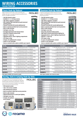 270WIRING ACCESSORIESTogether we GENERATE VALUECaravan Hook-UpsClassic Hook-Up Pedestal Quantum Hook-Up PedestalTouring, Static & Camping Hook-Up UnitsHighly acclaimed across the UK%u2019s caravan and holiday park industry, the Classic is a versatile touring hook-up pedestal that is ideal for all budgets and locations. A stylish yet sophisticated anodised aluminium touring pedestal. The QUANTUM presents an attractive and heavyduty hook-up solution. These cost eff ective and hard-wearing hook-up units are suitable for all caravan and holiday parks. With IP44 interlock sockets, these hook-up units ensure a safe and secure electrical connection(s). Available in non-metered, metered and smartcard metered versions.%u2022 16A IP44 interlock sockets%u2022 Available in 1, 2, 3 & 4way versions%u2022 18th edition regulations compliant%u2022 MID compliant kWh metering & pre-paid smartcard metering options%u2022 Photocell controlled LED amenity lighting head%u2022 Built-in overload and 30mA fault current protection%u2022 Built-in cable terminals%u2022 Switchgear access flap%u2022 Heavy-duty aluminium body & panels%u2022 High impact resistant polycarbonate lighting lens%u2022 Segregated electric, water & lighting compartments%u2022 Optional %u00bd%u201d water tap%u2022 IK10 impact rating%u2022 IP rated, UV stabilised & fire resistant%u2022 Surface or root mountable %u2022 Green as standard (other options available upon request)%u2022 IP44 interlock sockets%u2022 16A to 32A versions available%u2022 IP65 weatherproof enclosure%u2022 Built-in overload & 30mA fault current protection%u2022 Built-in cable terminals%u2022 Optional photocell kit to control park lighting%u2022 Switchgear access flap%u2022 IP Rated, UV stabilised & fire resistantPart No. DescriptionLSCL0010 1 x 16A 230V IP44 Interlock Socket, 1 x 16A 30mA RCBO, 2 x 2.3W LED Illumination, Non-MeteredLSCL0020 2 x 16A 230V IP44 Interlock Sockets, 2 x 16A 30mA RCBOs, 2 x 2.3W LED Illumination, Non-MeteredLSCL0030 3 x 16A 230V IP44 Interlock Sockets, 3 x 16A 30mA RCBOs, 2 x 2.3W LED Illumination, Non-MeteredLSCL0040 4 x 16A 230V IP44 Interlock Sockets, 4 x 16A 30mA RCBOs, 2 x 2.3W LED Illumination, Non-MeteredLSCL0110 1 x 16A 230V IP44 Interlock Socket, 1 x 16A 30mA RCBO, 2 x 2.3W LED Illumination, 1 x kWh Mini Meter LSCL0120 2 x 16A 230V IP44 Interlock Sockets, 2 x 16A 30mA RCBOs, 2 x 2.3W LED Illumination, 2 x kWh Mini MetersLSCL0130 3 x 16A 230V IP44 Interlock Sockets, 3 x 16A 30mA RCBOs, 2 x 2.3W LED Illumination, 3 x kWh Mini Meters LSCL0140 4 x 16A 230V IP44 Interlock Sockets, 4 x 16A 30mA RCBOs, 2 x 2.3W LED Illumination, 4 x kWh Mini MetersGMCP0010 Classic Standard Galvanised Steel Ground Mounting BaseOther options available. Ask in branch for detailsPart No. DescriptionLSQU0010 1 x 16A 230V IP44 Interlock Socket, 1 x 16A 30mA RCBO, 1 x 9W LED Illumination, Non-MeteredLSQU0020 2 x 16A 230V IP44 Interlock Sockets, 2 x 16A 30mA RCBOs, 1 x 9W LED Illumination, Non-MeteredLSQU0030 3 x 16A 230V IP44 Interlock Sockets, 3 x 16A 30mA RCBOs, 1 x 9W LED Illumination, Non-MeteredLSQU0040 4 x 16A 230V IP44 Interlock Sockets, 4 x 16A 30mA RCBOs, 1 x 9W LED Illumination, Non-MeteredLSQU0110 1 x 16A 230V IP44 Interlock Socket, 1 x 16A 30mA RCBO, 1 x 9W LED Illumination, 1 x kWh Mini Meter LSQU0120 2 x 16A 230V IP44 Interlock Sockets, 2 x 16A 30mA RCBOs, 1 x 9W LED Illumination, 2 x kWh Mini MetersLSQU0130 3 x 16A 230V IP44 Interlock Sockets, 3 x 16A 30mA RCBOs, 1 x 9W LED Illumination, 3 x kWh Mini Meters LSQU0140 4 x 16A 230V IP44 Interlock Sockets, 4 x 16A 30mA RCBOs, 1 x 9W LED Illumination, 4 x kWh Mini MetersGMQR0010 Quantum Galvanised Steel Ground Mounting BaseOther options available. Ask in branch for detailsPart No. DescriptionLSHU0010 1 x 16A 230V IP44 Interlock Socket, 1 x 16A 30mA RCBOLSHU0015 1 x 32A 230V IP44 Interlock Socket, 1 x 32A 30mA RCBO LSHU0020 2 x 16A 230V IP44 Interlock Sockets, 2 x 16A 30mA RCBOsLSHU0025 2 x 32A 230V IP44 Interlock Sockets, 2 x 32A 30mA RCBOs LSHU0030 3 x 16A 230V IP44 Interlock Sockets, 3 x 16A 30mA RCBOsLSHU0040 4 x 16A 230V IP44 Interlock Sockets, 4 x 16A 30mA RCBOsLSHU0045 4 x 32A 230V IP44 Interlock Sockets, 4 x 32A 30mA RCBOsLSHU0110 1 x 16A 230V IP44 Interlock Socket, 1 x 16A 30mA RCBO, 1 x 45A kWh MeterLSHU0115 1 x 32A 230V IP44 Interlock Socket, 1 x 32A 30mA RCBO, 1 x 45A kWh MeterLSHU0120 2 x 16A 230V IP44 Interlock Sockets, 2 x 16A 30mA RCBOs, 2 x 45A kWh MetersLSHU0125 2 x 32A 230V IP44 Interlock Sockets, 2 x 32A 30mA RCBOs, 2 x 45A kWh Meters LSHU0130 3 x 16A 230V IP44 Interlock Sockets, 3 x 16A 30mA RCBOs, 3 x 45A kWh MetersLSHU0140 4 x 16A 230V IP44 Interlock Sockets, 4 x 16A 30mA RCBOs, 4 x 45A kWh MetersLSHU0210 1 x 16A 230V IP44 Interlock Socket, 1 x 16A 30mA RCBO, 1 x Smartcard MeterLSHU0215 1 x 32A 230V IP44 Interlock Socket, 1 x 32A 30mA RCBO, 1 x Smartcard MeterLSAF0060 1350mm Galvanised Steel Post to Suit Small & Large Hook-Up EnclosuresOther options available. Ask in branch for details%u2022 16A IP44 interlock sockets%u2022 Available in 1, 2, 3 & 4way versions%u2022 18th edition regulations compliant%u2022 MID compliant kWh metering & pre-paid smartcard metering options%u2022 Photocell controlled LED amenity lighting head%u2022 Built-in overload and 30mA fault current protection%u2022 Built-in cable terminals%u2022 Switchgear access flap%u2022 Hot-dipped galvanised steel internal chassis%u2022 Aluminium composite external shell%u2022 Optional %u00bd%u201d water tap%u2022 Segregated electric, water & lighting compartments%u2022 IK10 impact rating%u2022 IP Rated, UV stabilised & fire resistant%u2022 Surface or root mountable%u2022 Green as standard (other options available upon request)