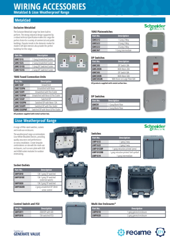 271WIRING ACCESSORIESTogether we GENERATE VALUEschneiderMetalclad & Lisse Weatherproof RangeMetalcladPart No. DescriptionGMC131S 1 Gang Unswitched SocketGMC132S 2 Gang Unswitched SocketGMC131SS 1 Gang DP Switched SocketGMC132SS 2 Gang DP Switched SocketExclusive MetalcladThe Exclusive Metalclad range has been built to perform. The strong industrial design supported by a robust technical specifi cation makes this range the perfect choice for a variety of commercial and public buildings. Popular trends in the domestic market for modern loft style interiors also provide the perfect backdrop for this range.10AX PlateswitchesPart No. DescriptionGMC612 1 Gang 2 WayGMC622 2 Gang 2 WayGMC632 3 Gang 2 WayGMCINT 1 Gang IntermediateDP SwitchesPart No. DescriptionGMC20S DP Switch 20AGMC20SN With Neon 20AGMC50S DP Switch 50AGMC50SN With Neon 50AGMC50S2N With Neon on Large Plate 50A10AX Fused Connection UnitsSocket OutletsSwitchesControl Switch and FCU Multi-Use Enclosures*Part No. DescriptionGMC13SP UnswitchedGMC13SPN Unswitched with NeonGMC13SPF Unswitched with Flex OutletGMC13SPNF Unswitched with Neon & Flex OutletGMC13SSP Switched DPGMC13SSPN Switched DP with Neon 13AGMC13SSPF Switched DP with Flex OutletGMC13SSPNF Switched DP with Neon & Flex OutletPart No. DescriptionLWP3010 13A 1 gang SP switchedLWP3010E 13A 1 gang SP switched (external switch)LWP3020 13A 2 gang SP switchedLWP3020R 2 gang unswitched DP 30mA - active controlPart No. DescriptionLWP1612 1 gang 2 wayLWP1622 2 gang 2 wayLWP1012RP 1 gang retractive printed %u2018press%u2019LWP1012RB 1 gang retractive printed %u2018bell symbol%u2019LWP1614 1 gang intermediatePart No. DescriptionLWP9010 1 gang general enclosureLWP9020 2 gang general enclosurePart No. DescriptionLWP2011 20AX DP with LED LWP5010 13A switched FCUDP SwitchesPart No. DescriptionGMCB1 1 Gang Blank PlateGMCB2 2 Gang Blank PlateAll products supplied with metal surface box.All products supplied with metal surface box.Lisse Weatherproof RangeA range of IP66 rated switches, sockets and multi-use enclosures. The weatherproof range accommodates Lisse White Moulded devices, providing quality assurance and performance on every installation. Create bespoke combinations on site with the multi-use enclosures, such as euro plate with USB and HDMI socket modules for outdoor entertaining.