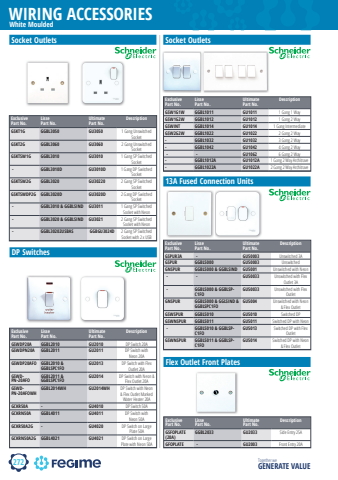 272WIRING ACCESSORIESTogether we GENERATE VALUEWhite MouldedSocket OutletsExclusive Part No.Lisse Part No.Ultimate Part No.DescriptionGSKT1G GGBL3050 GU3050 1 Gang Unswitched Socket GSKT2G GGBL3060 GU3060 2 Gang Unswitched Socket GSKTSW1G GGBL3010 GU3010 1 Gang SP Switched Socket - GGBL3010D GU3010D 1 Gang DP Switched SocketGSKTSW2G GGBL3020 GU30220 2 Gang SP Switched Socket GSKTSWDP2G GGBL3020D GU3020D 2 Gang DP Switched Socket - GGBL3010 & GGBLSIND GU3011 1 Gang SP Switched Socket with Neon - GGBL3020 & GGBLSIND GU3021 2 Gang SP Switched Socket with Neon - GGBL30202USBAS GGBGU3024D 2 Gang SP Switched Socket with 2 x USBSocket OutletsExclusive Part No.Lisse Part No.Ultimate Part No.DescriptionGSW1G1W GGBL1011 GU1011 1 Gang 1 Way%u00a0GSW1G2W GGBL1012 GU1012 1 Gang 2 Way%u00a0GSWINT GGBL1014 GU1014 1 Gang Intermediate%u00a0GSW2G2W GGBL1022 GU1022 2 Gang 2 Way%u00a0- GGBL1032 GU1032 3 Gang 2 Way%u00a0- GGBL1042 GU1042 4 Gang 2 Way%u00a0%u00a0-%u00a0 %u00a0-%u00a0 GU1062 6 Gang 2 Way%u00a0- GGBL1012A GU1012A 1 Gang 2 Way Architrave- GGBL1022A GU1022A 2 Gang 2 Way ArchitraveDP SwitchesExclusive Part No.Lisse Part No.Ultimate Part No.DescriptionGSWDP20A GGBL2010 GU2010 DP Switch 20AGSWDPN20A GGBL2011 GU2011 DP Switch with Neon 20A%u00a0GSWDP20AFO GGBL2010 & GGBLSPC1FOGU2013 DP Switch with Flex Outlet 20AGSWDPN-20AFOGGBL2011 & GGBLSPC1FOGU2014 DP Switch with Neon & Flex Outlet 20AGSWDPN-20AFOWHGGBL2014WH GU2014WH DP Switch with Neon & Flex Outlet Marked Water Heater 20AGCKR50A - GU4010 DP Switch 50AGCKRN50A GGBL4011%u00a0 GU4011 DP Switch with Neon 50AGCKR50A2G - GU4020 DP Switch on Large Plate 50AGCKRN50A2G GGBL4021 GU4021 DP Switch on Large Plate with Neon 50AFlex Outlet Front PlatesExclusive Part No.Lisse Part No.Ultimate Part No.DescriptionGSFOPLATE (20A)GGBL2033 GU2033%u00a0 Side Entry 25AGFOPLATE %u00a0-%u00a0 GU2003%u00a0 Front Entry 20A13A Fused Connection UnitsExclusive Part No.Lisse Part No.Ultimate Part No.DescriptionGSPUR3A %u00a0-%u00a0 GU50003 Unswitched 3AGSPUR GGBL5000 GU50003 Unswitched%u00a0GNSPUR GGBL5000 & GGBLSIND GU5001 Unswitched with Neon%u00a0-%u00a0 %u00a0-%u00a0 GU50033 Unswitched with Flex Outlet 3A%u00a0-%u00a0 GGBL5000 & GGBLSPC1FOGU50033 Unswitched with Flex OutletGNSPUR GGBL5000 & GGLSIND & GGBLSPC1FOGU5004 Unswitched with Neon & Flex OutletGSWSPUR GGBL5010 GU5010 Switched DPGSWNSPUR GGBL5011 GU5011 Switched DP with Neon%u00a0-%u00a0 GGBL5010 & GGBLSPC1FOGU5013 Switched DP with Flex OutletGSWNSPUR GGBL5011 & GGBLSPC1FOGU5014 Switched DP with Neon & Flex Outlet