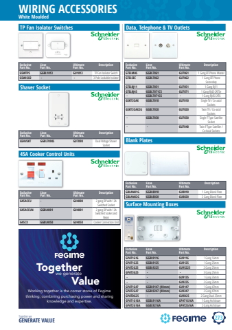 273WIRING ACCESSORIESTogether we GENERATE VALUEWhite MouldedTP Fan Isolator SwitchesExclusive Part No.Lisse Part No.Ultimate Part No.DescriptionGSWTPS GGBL1013 GU1013 TP Fan Isolator SwitchGSWISO2 %u00a0-%u00a0 %u00a0-%u00a0 3 Pole Lockable IsolatorData, Telephone & TV OutletsExclusive Part No.Lisse Part No.Ultimate Part No.DescriptionGTELMAS GGBL7061 GU7061 1 Gang BT Phone MasterGTELSEC GGBL7062 GU7062 1 Gang BT Phone Secondary%u00a0GTELRJ11 GGBL7051 GU7051 1 Gang RJ11%u00a0GTELRJ45 GGBL7071C5 GU7071 1 Gang RJ45 CAT5e%u00a0-%u00a0 GGBL7071C6 %u00a0-%u00a0 1 Gang RJ45 CAT6GSKTCOAX GGBL7010 GU7010 Single TV / Co-axial Sockets%u00a0GSKTCOAX2G GGBL7020 GU7020 Twin TV / Co-axial Sockets%u00a0-%u00a0 GGBL7030 GU7030 Single F Type Satellite Socket%u00a0%u00a0-%u00a0 %u00a0-%u00a0 GU7040 Twin F Type Satellite / Co-Axial Sockets45A Cooker Control UnitsExclusive Part No.Lisse Part No.Ultimate Part No.DescriptionG45ACCU - GU4000 2 gang DP with 13A Switched SocketG45ACCUN GGBL4001 GU4001 2 gang DP with 13A Switched Socket and NeonG45CX GGBL4050 GU4050 Cooker Connection UnitSurface Mounting BoxesBlank PlatesShaver SocketExclusive Part No.Lisse Part No.Ultimate Part No.DescriptionGSHVSKT GGBL7090S GU7090 Dual Voltage Shaver SocketExclusive Part No.Lisse Part No.Ultimate Part No.DescriptionGBLANK1G GGBL8010 GU8010 1 Gang Blank Plate%u00a0GBLANK2G GGBL8020 GU8020 2 Gang Blank PlateExclusive Part No.Lisse Part No.Ultimate Part No.DescriptionGPAT1G16 GGBL9116 GU9116 1 Gang 16mmGPAT1G25 GGBL9125 GU9125 1 Gang 25mmGPAT2G25 GGBL9225 GU95225 2 Gang 25mmGPAT3G25 %u00a0-%u00a0 %u00a0-%u00a0 3 Gang 25mm%u00a0-%u00a0 %u00a0-%u00a0 GU9135 1 Gang 35mm%u00a0-%u00a0 %u00a0-%u00a0 GU9235 2 Gang 35mm%u00a0GPAT1G47 GGBL9147 (40mm) GU9147 1 Gang 47mmGPAT2G47 GGBL9247 (40mm) GU9247 2 Gang 47mmGPATDG25 %u00a0-%u00a0 GU9D25 2 Gang Dual 25mmGPAT1G16A GGBL9116A GPAT1G16A 1 Gang ArchitraveGPAT2G16A GGBL9216A GPAT2G16A 2 Gang ArchitraveTogetherValuewe generateWorking together is the corner stone of Fegime thinking; combining purchasing power and sharing knowledge and expertise.