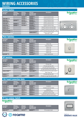 274WIRING ACCESSORIESTogether we GENERATE VALUEDecorativeSocket OutletsLisse Deco Part No.Ultimate Low Profi le Part No.Ultimate Flat Plate Part No.Ultimate Screwless Flat Plate Part No. Description%u00a0-%u00a0 %u00a0-%u00a0 GU3250*** GU3450*** 1 gang Unswitched Socket%u00a0GGBL3060***S %u00a0-%u00a0 GU3260*** GU3460*** 2 gang Unswitched Socket%u00a0GGBL3010*** GU3510*** GU3210*** GU3410*** 1 gang SP Switched Socket%u00a0GGBL3010D*** %u00a0-%u00a0 GU3210D*** GU3410D*** 1 gang DP Switched SocketGGBL3020*** GU3520*** GU3220*** GU3420*** 2 gang SP Switched Socket%u00a0GGBL3020D*** GU3530*** GU3220D*** GU3420D*** 2 gang DP Switched SocketGGBL3011D***%u00a0 %u00a0-%u00a0 %u00a0-%u00a0 GU3411D*** 1 gang DP Switched Socket with NeonGGBL3021D*** %u00a0-%u00a0 %u00a0-%u00a0 GU3421D*** 2 gang DP Switched Socket with Neon%u00a0GGBL30102USBA***S %u00a0-%u00a0 %u00a0-%u00a0 %u00a0-%u00a0 1 gang SP Switched Socket outlet with 2 x USBGGBL30202USBA***S %u00a0-%u00a0 %u00a0-%u00a0 GGBGU3424D*** 2 gang SP Switched Socketoutlet with 2 x USBPlate SwitchesLisse Deco Part No.Ultimate Low Profi le Part No.Ultimate Flat Plate Part No.Ultimate Screwless Flat Plate Part No. DescriptionGGBL1012*** GU1512*** GU1212*** GU1412*** 1 gang 2 way%u00a0GGBL1014*** GU1514*** GU1214*** GU1414*** 1 gang Intermediate%u00a0GGBL1022*** GU1522*** GU1222*** GU1422*** 2 gang 2 way%u00a0GGBL1032*** GU1532*** GU1232*** GU1432*** 3 gang 2 way%u00a0GGBL1042*** GU1542*** GU1242*** GU1442*** 4 gang 2 way%u00a0%u00a0-%u00a0 %u00a0-%u00a0 GU1262*** GU1462*** 6 gang 2 way%u00a0GU1012R***S %u00a0-%u00a0 GU1212R*** GU1412R*** 1 gang 2 way RetractiveDP SwitchesLisse Deco Part No.Ultimate Low Profi le Part No.Ultimate Flat Plate Part No.Ultimate Screwless Flat Plate Part No. DescriptionGGBL2010***S %u00a0-%u00a0 GU2210*** GU2410*** DP Switch 20AGGBL2011***S GU2511*** GU2211*** GU2411*** DP Switch with Neon 20A%u00a0%u00a0-%u00a0 GU2513*** GU2213*** GU2413*** DP Switch with Flex Outlet 20A%u00a0-%u00a0 %u00a0-%u00a0 GU2214*** GU2414*** DP Switch with Neon & Flex Outlet 20AGGBL2014WH*** %u00a0-%u00a0 GU2214WH*** GU2414WH*** DP Switch with Neon & Flex Outlet marked Water Heater 20AGGBL4011*** %u00a0-%u00a0 %u00a0-%u00a0 %u00a0-%u00a0 DP Switch with Neon 50AGGBL4021*** GU4521*** GU4221*** GU4421*** DP Switch on Large Plate with Neon 50A13A Fused Connection UnitsLisse Deco Part No.Ultimate Low Profi le Part No.Ultimate Flat Plate Part No.Ultimate Screwless Flat Plate Part No. DescriptionGGBL5000*** GU5500*** GU5200*** GU5400*** Unswitched%u00a0GGBL5003*** %u00a0-%u00a0 GU5203*** GU5403*** Unswitched with Flex Outlet%u00a0GGBL5010*** GU5510*** GU5210*** GU5410*** Switched DPGGBL5011*** GU5511*** GU5211*** GU5411*** Switched DP with Neon%u00a0-%u00a0 %u00a0-%u00a0 GU5213*** GU5413*** Switched DP with Flex OutletGGBL5013*** GU5514*** GU5214*** GU5414*** Switched DP with Neon & Flex Outlet%u00a0TP Fan Isolator SwitchLisse Deco Part No.Ultimate Low Profi le Part No.Ultimate Flat Plate Part No.Ultimate Screwless Flat Plate Part No. DescriptionGGBL1013*** GU1513***%u00a0 GU1213*** GU1413*** TP Fan Isolator Switch