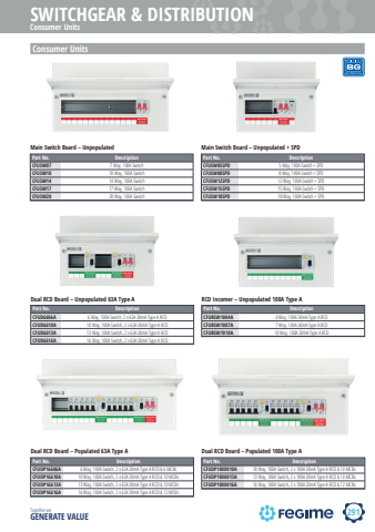 291SWITCHGEAR & DISTRIBUTIONTogether we GENERATE VALUEConsumer Unitsluceco BG british generalConsumer UnitsPart No. DescriptionCFUSW07 7 Way, 100A SwitchCFUSW10 10 Way, 100A SwitchCFUSW14 14 Way, 100A SwitchCFUSW17 17 Way, 100A SwitchCFUSW20 20 Way, 100A SwitchPart No. DescriptionCFURSW1004A 4 Way, 100A 30mA Type A RCDCFURSW1007A 7 Way, 100A 30mA Type A RCDCFURSW1010A 10 Way, 100A 30mA Type A RCDMain Switch Board %u2013 UnpopulatedRCD Incomer %u2013 Unpopulated 100A Type APart No. DescriptionCFUD6606A 6 Way, 100A Switch, 2 x 63A 30mA Type A RCDCFUD6610A 10 Way, 100A Switch, 2 x 63A 30mA Type A RCDCFUD6613A 13 Way, 100A Switch, 2 x 63A 30mA Type A RCDCFUD6616A 16 Way, 100A Switch, 2 x 63A 30mA Type A RCDDual RCD Board %u2013 Unpopulated 63A Type APart No. DescriptionCFUDP16606A 6 Way, 100A Switch, 2 x 63A 30mA Type A RCD & 6 MCBsCFUDP16610A 10 Way, 100A Switch, 2 x 63A 30mA Type A RCD & 10 MCBsCFUDP16613A 13 Way, 100A Switch, 2 x 63A 30mA Type A RCD & 10 MCBsCFUDP16616A 16 Way, 100A Switch, 2 x 63A 30mA Type A RCD & 12 MCBsDual RCD Board %u2013 Populated 63A Type APart No. DescriptionCFUSW05SPD 5 Way, 100A Switch + SPDCFUSW08SPD 8 Way, 100A Switch + SPDCFUSW12SPD 12 Way, 100A Switch + SPDCFUSW15SPD 15 Way, 100A Switch + SPDCFUSW18SPD 18 Way, 100A Switch + SPDMain Switch Board %u2013 Unpopulated + SPDPart No. DescriptionCFUDP1000010A 10 Way, 100A Switch, 2 x 100A 30mA Type A RCD & 10 MCBsCFUDP1000013A 13 Way, 100A Switch, 2 x 100A 30mA Type A RCD & 10 MCBsCFUDP1000016A 16 Way, 100A Switch, 2 x 100A 30mA Type A RCD & 12 MCBsDual RCD Board %u2013 Populated 100A Type A