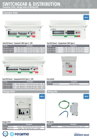 292SWITCHGEAR & DISTRIBUTIONTogether we GENERATE VALUEConsumer Units, Garage Units & Wiring KitsConsumer UnitsDual RCD Board %u2013 Unpopulated 100A Type APart No. DescriptionCFUD1000010A 10 Way, 100A Switch, 2 x 100A 30mA Type A RCDCFUD1000013A 13 Way, 100A Switch, 2 x 100A 30mA Type A RCDCFUD1000016A 16 Way, 100A Switch, 2 x 100A 30mA Type A RCDPart No. DescriptionCFUDP1000008ASPD 8 Way, 100A Switch, 2 x 100A 30mA Type A RCD, 8 MCBs + SPDCFUDP1000011ASPD 11 Way, 100A Switch, 2 x 100A 30mA Type A RCD, 10 MCBs + SPDCFUDP1000014ASPD 14 Way, 100A Switch, 2 x 100A 30mA Type A RCD, 12 MCBs + SPDDual RCD Board %u2013 Populated 100A Type A + SPDDual RCD Board %u2013 Unpopulated 63A Type A + SPD Fuse SwitchPart No. DescriptionCFUDP16608ASPD 8 Way, 100A Switch, 2 x 63A 30mA Type A RCD, 8 MCBs + SPDCFUDP16611ASPD 11 Way, 100A Switch, 2 x 63A 30mA Type A RCD, 10 MCBs + SPDCFUDP16614ASPD 14 Way, 100A Switch, 2 x 63A 30mA Type A RCD, 12 MCBs + SPDPart No. DescriptionCFUFS100 4 Module, 100A SwitchGarage UnitsPart No. DescriptionCFGAR1A Garage Kit %u2013 IP65, 40A, 30mA TYPE A RCD, 6+32A MCBCFGAR2 Garage Kit %u2013 IP65, 100A Main Switch, 6 + 16A MCBGarage UnitsWiring KitsPart No. DescriptionCUA30 SPD Wiring Kit C/W Neutral & Earth Wires 1 X SPD T2Wiring Kits