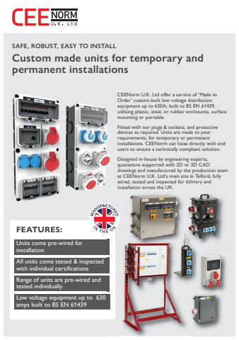 CeenormCustom made units for temporary and permanent installationsSAFE, ROBUST, EASY TO INSTALLCEENorm U.K. Ltd o%u0012er a service of %u2018Made to Order%u2019 custom-built low voltage distribution equipment up to 630A; built to BS EN 61439, utilising plastic, steel, or rubber enclosures, surface mounting or portable. Fitted with our plugs & sockets, and protective devices as required. Units are made to your requirements, for temporary or permanent installations. CEENorm can liaise directly with end users to ensure a technically compliant solution. Designed in-house by engineering experts, quotations supported with 2D or 3D CAD drawings and manufactured by the production team at CEENorm U.K. Ltd%u2019s main site in Telford, fully wired, tested and inspected for delivery and installation across the UK.FEATURES:Units come pre-wired for installationAll units come tested & inspected with individual certi%u0093cationsRange of units are pre-wired and tested individuallyLow voltage equipment up to 630 amps built to BS EN 61439installation across the UK.wired, tested and inspected for delivery and