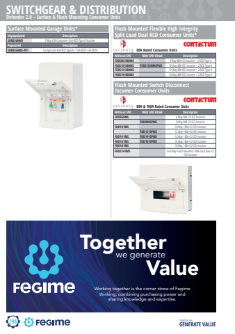 298SWITCHGEAR & DISTRIBUTIONTogether we GENERATE VALUEDefender 2.0 %u2013 Surface & Flush Mounting Consumer UnitsWithout SPD With SPD Fitted DescriptionFDDS06188AMS 6 Way 80A ISO Incomer + 2 RCD Type AFDDS10188AMS FDDS10188ASPMS 10 Way 80A ISO Incomer + 2 RCD Type AFDDS12188AMS 12 Way 80A ISO Incomer + 2 RCD Type AFDDS14188AMS 14 Way 80A ISO Incomer + 2 RCD Type A80A Rated Consumer UnitsFlush Mounted Flexible High IntegritySplit Load Dual RCD Consumer Units*Without SPD With SPD Fitted DescriptionFDD068MS 6 Way 80A CU ISO IncomerFDD088SPMS 8 Way 80A CU ISO IncomerFDD101MS 10 Way 100A CU ISO IncomerFDD121SPMS 12 Way 100A CU ISO IncomerFDD141MS FDD141SPMS 14 Way 100A CU ISO IncomerFDD161MS FDD161SPMS 16 Way 100A CU ISO IncomerFDD181MS 18 Way 100A CU ISO IncomerFDD2141MS 6+8 Way Flush Mounted 100A Dual Row CU ISO Incomer80A & 100A Rated Consumer UnitsFlush Mounted Switch DisconnectIncomer Consumer UnitsUnpopulated DescriptionSDR026AMS 2 Way 63A Consumer Unit RCD Type A IncomerPopulated DescriptionSDR026AMS-P01 Garage Unit 63A RCD Type A + 16A MCB + 6A MCBSurface Mounted Garage Units*TogetherValuewe generateWorking together is the corner stone of Fegime thinking; combining purchasing power and sharing knowledge and expertise.