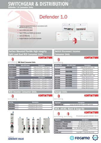 299SWITCHGEAR & DISTRIBUTIONTogether we GENERATE VALUEDefender 1.0 Consumer UnitsSurface Mounted Flexible High IntegritySplit Load Dual RCD Consumer UnitsWithout SPD With SPD Fitted DescriptionDDS08188AMS 8 Way ISO Incomer + 2 RCD Type ADDS10188AMS DDS10188ASPMS 10 Way ISO Incomer + 2 RCD Type ADDS12188AMS DDS12188ASPMS 12 Way ISO Incomer + 2 RCD Type ADDS14188AMS DDS14188ASPMS 14 Way ISO Incomer + 2 RCD Type ADDS16188AMS 16 Way ISO Incomer + 2 RCD Type APopulated DescriptionDDS08188AMS-P01 8 Way ISO Incomer + 2 RCD Type A + 8 MCBDDS10188AMS-P01 DDS10188ASPMS-P01 10 Way ISO Incomer + 2 RCD Type A + 10 MCBDDS12188AMS-P01 DDS12188ASPMS-P01 12 Way ISO Incomer + 2 RCD Type A + 10 MCBDDS14188AMS-P01 DDS14188ASPMS-P01 14 Way ISO Incomer + 2 RCD Type A + 10 MCBDDS16188AMS-P01 16 Way ISO Incomer + 2 RCD Type A + 10 MCB80A Rated Consumer UnitsWithout SPD With SPD Fitted DescriptionDD006SPMS 0 Way 63A ISO Incomer + SPDDD026MS 2 Way 63A ISO IncomerDD041MS DD041SPMS 4 Way 100A ISO IncomerDD061MS 6 Way 100A ISO IncomerDD081SPMS 8 Way 100A ISO Incomer + SPDDD101MS DD101SPMS 10 Way 100A ISO IncomerDD121MS DD121SPMS 12 Way 100A ISO IncomerDD141MS DD141SPMS 14 Way 100A ISO IncomerDD161MS DD161SPMS 16 Way 100A ISO IncomerDD181MS DD181SPMS 18 Way 100A ISO IncomerDD201MS 20 Way 100A ISO IncomerRCD Incomer Consumer UnitsPart No. DescriptionDR026AMS 2 Way 63A RCD Type A IncomerDR048AMS 4 Way 80A RCD Type A IncomerDR068AMS 6 Way 80A RCD Type A IncomerGarage UnitsPopulated DescriptionDR026AMS-P01 Garage Unit 63A RCD Type A + 16A MCB + 6A MCBMCB, eRCBO, Blank & Surge KitPopulated DescriptionAFDR0606AB to AFDR0640AB 6A - 40A 6kA Curve B AFDDCPB0603B to CPB0640B 3A - 40A 6kA Curve B SP MCBCPB0650B & CPB0663B 50A - 63A 4.5kA Curve B SP MCBCCPBR0606AB to CCPBR0650AB 6A - 50A 6kA Type A Curve B SP Compact RCBOCPBBL MCB BlankT2C4011KIT Surge 40KA 1+1 Protection Retro Fit KitSwitch Disconnect IncomerConsumer UnitsAll accessories applicable to Defender 1.0 & 2.0