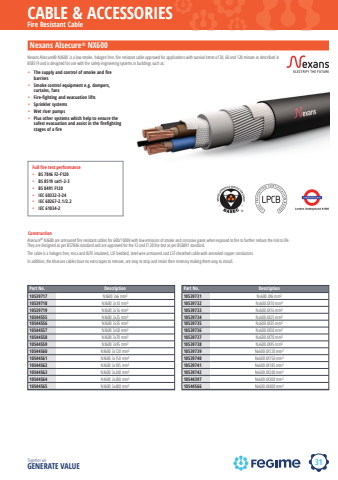 31CABLE & ACCESSORIESTogether we GENERATE VALUEnexansFire Resistant CableNexans Alsecure%u00ae NX600%u2022 The supply and control of smoke and fire barriers%u2022 Smoke control equipment e.g. dampers, curtains, fans%u2022 Fire-fighting and evacuation lifts%u2022 Sprinkler systems%u2022 Wet riser pumps%u2022 Plus other systems which help to ensure the safest evacuation and assist in the firefighting stages of a firePart No. Description10539717 NX600 3x6 mm%u00b210539718 NX600 3x10 mm%u00b210539719 NX600 3x16 mm%u00b210544555 NX600 3x25 mm%u00b210544556 NX600 3x35 mm%u00b210544557 NX600 3x50 mm%u00b210544558 NX600 3x70 mm%u00b210544559 NX600 3x95 mm%u00b210544560 NX600 3x120 mm%u00b210544561 NX600 3x150 mm%u00b210544562 NX600 3x185 mm%u00b210544563 NX600 3x240 mm%u00b210544564 NX600 3x300 mm%u00b210544565 NX600 3x400 mm%u00b2Nexans Alsecure%u00ae NX600 is a low smoke, halogen free, fi re resistant cable approved for applications with survival times of 30, 60 and 120 minute as described in BS8519 and is designed for use with fi re safety engineering systems in buildings such as:Full fire test performance%u2022 BS 7846 F2-F120 %u2022 BS 8519 cat1-2-3 %u2022 BS 8491 F120 %u2022 IEC 60332-3-24 %u2022 IEC 60267-2.1/2.2 %u2022 IEC 61034-2ConstructionAlsecure%u00ae NX600 are armoured fi re resistant cables for 600/1000V with low emission of smoke and corrosive gases when exposed to fi re to further reduce the risk to life. They are designed as per BS7846 standard and are approved for the F2 and F120 fi re test as per BS8491 standard.The cable is a halogen free, mica and XLPE insulated, LSF bedded, steel wire armoured and LSF sheathed cable with annealed copper conductors.In addition, the Alsecure cables have no extra tapes to remove, are easy to strip and retain their memory making them easy to install. Part No. Description10539731 Nx600 4X6 mm%u00b210539732 Nx600 4X10 mm%u00b210539733 Nx600 4X16 mm%u00b210539734 Nx600 4X25 mm%u00b210539735 Nx600 4X35 mm%u00b210539736 Nx600 4X50 mm%u00b210539737 Nx600 4X70 mm%u00b210539738 Nx600 4X95 mm%u00b210539739 Nx600 4X120 mm%u00b210539740 Nx600 4X150 mm%u00b210539741 Nx600 4X185 mm%u00b210539742 Nx600 4X240 mm%u00b210544397 Nx600 4X300 mm%u00b210544566 Nx600 4X400 mm%u00b2