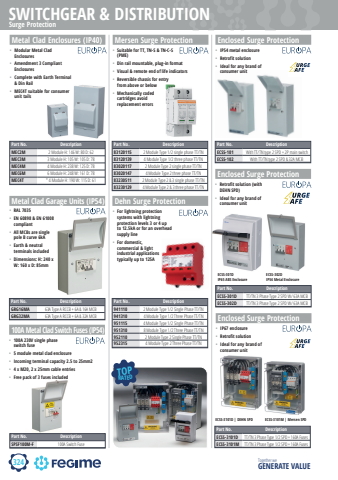 324SWITCHGEAR & DISTRIBUTIONTogether we GENERATE VALUEEnclosed Surge Protection%u2022 IP54 metal enclosure%u2022 Retrofit solution%u2022 Ideal for any brand of consumer unitsurge safeSurge ProtectionMetal Clad Enclosures (IP40) Mersen Surge Protection%u2022 Suitable for TT, TN-S & TN-C-S (PME)%u2022 Din rail mountable, plug-in format %u2022 Visual & remote end of life indicators %u2022 Reversible chassis for entry from above or below %u2022 Mechanically coded cartridges avoid replacement errorsPart No. DescriptionMEC2M 2 Module H: 146 W: 80 D: 62MEC3M 3 Module H: 105 W: 105 D: 78MEC4M 4 Module H: 238 W: 125 D: 78MEC6M 6 Module H: 248 W: 161 D: 78MEC4T * 4 Module H: 190 W: 115 D: 61Part No. Description83120115 2 Module Type 1/2 single phase TT/TN83120139 4 Module Type 1/2 three phase TT/TN83020117 2 Module Type 2 single phase TT/TN83020147 4 Module Type 2 three phase TT/TN83230511 2 Module Type 2 & 3 single phase TT/TN83230129 4 Module Type 2 & 3 three phase TT/TNPart No. DescriptionECSS-101 With TT/TN type 2 SPD + 2P main switchECSS-102 With TT/TN type 2 SPD & 32A MCBMetal Clad Garage Units (IP54) Dehn Surge ProtectionPart No. DescriptionGRG16MA 63A Type A RCCB + 6A & 16A MCBGRG32MA 63A Type A RCCB + 6A & 32A MCBPart No. Description941110 2 Module Type 1/2 Single Phase TT/TN941310 4 Module Type 1/2 Three Phase TT/TN951115 4 Module Type 1/2 Single Phase TT/TN951310 8 Module Type 1/2 Three Phase TT/TN952110 2 Module Type 2 Single Phase TT/TN952315 4 Module Type 2 Three Phase TT/TN100A Metal Clad Switch Fuses (IP54)%u2022 100A 230V single phase switch fuse %u2022 5 module metal clad enclosure%u2022 Incoming terminal capacity 2.5 to 25mm2%u2022 4 x M20, 2 x 25mm cable entries%u2022 Free pack of 3 fuses includedPart No. DescriptionSPSF100M-F 100A Switch FuseEnclosed Surge Protection%u2022 Retrofit solution (with DEHN SPD)%u2022 Ideal for any brand of consumer unitPart No. DescriptionECSS-301D TT/TN 3 Phase Type 2 SPD W/ 63A MCBECSS-302D TT/TN 3 Phase Type 2 SPD W/ 63A MCBEnclosed Surge Protection%u2022 IP67 enclosure%u2022 Retrofit solution %u2022 Ideal for any brand of consumer unitPart No. DescriptionECSS-3101D TT/TN 3 Phase Type 1/2 SPD + 160A FusesECSS-3101M TT/TN 3 Phase Type 1/2 SPD + 160A FusesECSS-301DIP65 ABS EnclosureECSS-302DIP54 Metal EnclosureECSS-3101D | DEHN SPD ECSS-3101M | Mersen SPDTOPRATED%u2022 For lightning protection systems with lightning protection levels 3 or 4 up to 12.5kA or for an overhead supply line%u2022 For domestic, commercial & light industrial applications typically up to 125A%u2022 RAL 7035%u2022 EN 60898 & EN 61008 compliant%u2022 All MCBs are single pole B curve 6kA%u2022 Earth & neutral terminals included%u2022 Dimensions: H: 240 x W: 160 x D: 85mm%u2022 Modular Metal Clad Enclosures %u2022 Amendment 3 Compliant Enclosures%u2022 Complete with Earth Terminal & Din Rail%u2022 MEC4T suitable for consumer unit tails