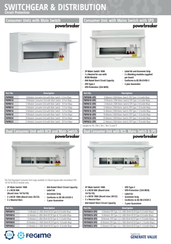 330SWITCHGEAR & DISTRIBUTIONTogether we GENERATE VALUEConsumer Units with Main SwitchDual Consumer Unit with RCD and Main Switch Dual Consumer Unit with RCD, Mains Switch & SPDConsumer Unit with Mains Switch with SPDPart No. DescriptionPBPM08 8 Module Consumer Unit with Main Switch - 6 Free WaysPBPM10 10 Module Consumer Unit with Main Switch - 8 Free WaysPBPM12 12 Module Consumer Unit with Main Switch - 10 Free WaysPBPM14 14 Module Consumer Unit with Main Switch - 12 Free WaysPBPM16 16 Module Consumer Unit with Main Switch - 14 Free WaysPBPM18 18 Module Consumer Unit with Main Switch - 16 Free WaysPBPM20 20 Module Consumer Unit with Main Switch - 18 Free WaysPBPM22 22 Module Consumer Unit with Main Switch - 20 Free WaysPart No. DescriptionPBPM08-SPD 8 Module (100A Mains Switch) SPD Type 2 4 Usable WaysPBPM10-SPD 10 Module (100A Mains Switch) SPD Type 2 6 Usable WaysPBPM12-SPD 12 Module (100A Mains Switch) SPD Type 2 8 Usable WaysPBPM14-SPD 14 Module (100A Mains Switch) SPD Type 2 10 Usable WaysPBPM16-SPD 16 Module (100A Mains Switch) SPD Type 2 12 Usable WaysPBPM18-SPD 18 Module (100A Mains Switch) SPD Type 2 14 Usable WaysPBPM20-SPD 20 Module (100A Mains Switch) SPD Type 2 16 Usable WaysPBPM22-SPD 22 Module (100A Mains Switch) SPD Type 2 18 Usable WaysPart No. DescriptionPBPDM14-SPD 14 Module SPD Type 2 (2 x 80A 30mA RCCB Type A 6 Usable Ways)PBPDM16-SPD 16 Module SPD Type 2 (2 x 80A 30mA RCCB Type A 8 Usable Ways)PBPDM18-SPD 18 Module SPD Type 2 (2 x 80A 30mA RCCB Type A 10 Usable Ways)PBPDM20-SPD 20 Module SPD Type 2 (2 x 100A 30mA RCCB Type A 12 Usable Ways)PBPDM22-SPD 22 Module SPD Type 2 (2 x 100A 30mA RCCB Type A 14 Usable Ways)Part No. DescriptionPBPDM14 14 Module (2 x 80A 30mA RCCB Type A) 8 Usable WaysPBPDM16 16 Module (2 x 80A 30mA RCCB Type A) 10 Usable WaysPBPDM18 18 Module (2 x 80A 30mA RCCB Type A) 12 Usable WaysPBPDM20 20 Module (2 x 100A 30mA RCCB Type A) 14 Usable WaysPBPDM22 22 Module (2 x 100A 30mA RCCB Type A) 16 Usable WaysCircuit Protection%u2022 2P Mains Switch 100A%u2022 1 x Neutral for use with RCBO Module%u2022 6kA Rated Short Circuit Capacity%u2022 SPD Type 2%u2022 SPD Protection (32A MCB)%u2022 Label kit and Grommet Strip%u2022 2 x Blanking modules supplied per board%u2022 Conforms to BS EN 61439-3%u2022 3 year Guarantee%u2022 2P Main Switch 100A%u2022 2 x RCCB 80A (Board sizes 14/16/18)%u2022 2 x RCCB 100A (Board sizes 20/22)%u2022 3 x Neutral Bars%u2022 6kA Rated Short Circuit Capacity%u2022 Label kit%u2022 Grommet Strip%u2022 Conforms to BS EN 61439-3%u2022 3 year Guarantee%u2022 2P Main Switch 100A%u2022 2 x RCCB 80A (Board sizes 14/16/18)%u2022 2 x RCCB 100A (Board sizes 20/22)%u2022 3 x Neutral Bars%u2022 6kA Rated Short Circuit Capacity%u2022 SPD Type 2%u2022 SPD Protection (32A MCB)%u2022 Label kit%u2022 Grommet Strip%u2022 Conforms to BS EN 61439-3%u2022 3 year GuaranteeSuitable for TN -(TN-S, TN-C, TN-C-S) and TTThe Part Populated Consumer Unit range available in 5 Board layouts with and without SPD - 14/16/18/20/22 module units.