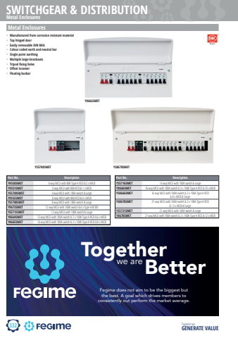 332SWITCHGEAR & DISTRIBUTIONTogether we GENERATE VALUEMetal EnclosuresY8666SMETYS5708SMET YS8678SMETTogether Better we areFegime does not aim to be the biggest but the best. A goal which drives members to consistently out perform the market average.Part No. DescriptionY9550SMET 4 way MCU with 80A Type A RCD & 2 x MCBY9551SMET 4 way MCU with 80A RCD & 1 x MCBYS5704SMET 4 way MCU with 100A switch & surgeY9552SMET 8 way MCU with 80A RCD & 6 x MCBYS5708SMET 8 way MCU with 100A switch & surgeY9673SMET 12 way MCU with 100A switch & 6 x Type A RCBOYS5712SMET 12 way MCU with 100A switch & surgeY8664SMET 12 way MCU with 100A switch & 2 x 100A Type A RCD & 6 x MCBY8665SMET 16 way MCU with 100A switch & 2 x 100A Type A RCD & 8 x MCBMetal Enclosures%u2022 Manufactured from corrosion resistant material%u2022 Top hinged door%u2022 Easily removable DIN RAIL%u2022 Colour coded earth and neutral bar%u2022 Single point earthing%u2022 Multiple large knockouts%u2022 Tripod fixing holes%u2022 Offset incomer%u2022 Floating busbarPart No. DescriptionYS5716SMET 16 way MCU with 100A switch & surgeY8666SMET 16 way MCU with 100A switch & 2 x 100A Type A RCD & 10 x MCBYS8666SMET 16 way MCU with 100A switch & 2 x 100A Type A RCD & 8 x MCB & SurgeYS8678SMET 21 way MCU with 100A switch & 2 x 100A Type A RCD & 12 x MCB & SurgeYS5721SMET 21 way MCU with 100A switch & surgeY8678SMET 21 way MCU with 100A switch & 2 x 100A Type A RCD & 12 x MCB