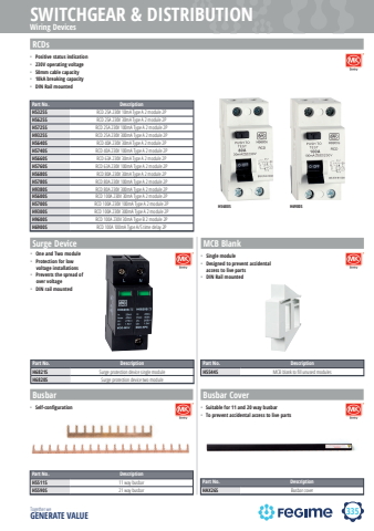 335SWITCHGEAR & DISTRIBUTIONTogether we GENERATE VALUEPart No. DescriptionH5325S RCD 25A 230V 10mA Type A 2 module 2PH5625S RCD 25A 230V 30mA Type A 2 module 2PH5725S RCD 25A 230V 100mA Type A 2 module 2PH9325S RCD 25A 230V 300mA Type A 2 module 2PH5640S RCD 40A 230V 30mA Type A 2 module 2PH5740S RCD 40A 230V 100mA Type A 2 module 2PH5660S RCD 63A 230V 30mA Type A 2 module 2PH5760S RCD 63A 230V 100mA Type A 2 module 2PH5680S RCD 80A 230V 30mA Type A 2 module 2PH5780S RCD 80A 230V 100mA Type A 2 module 2PH9380S RCD 80A 230V 300mA Type A 2 module 2PH5600S RCD 100A 230V 30mA Type A 2 module 2PH5700S RCD 100A 230V 100mA Type A 2 module 2PH9300S RCD 100A 230V 300mA Type A 2 module 2PH9600S RCD 100A 230V 30mA Type B 2 module 2PH6900S RCD 100A 100mA Type A/S time delay 2PPart No. DescriptionH5544S MCB blank to fi ll unused modulesPart No. DescriptionH5511S 11 way busbarH5590S 21 way busbarPart No. DescriptionHAX26S Busbar coverRCDs%u2022 Positive status indication%u2022 230V operating voltage%u2022 50mm cable capacity%u2022 10kA breaking capacity%u2022 DIN Rail mountedMCB Blank%u2022 Single module%u2022 Designed to prevent accidental access to live parts%u2022 DIN Rail mountedBusbar%u2022 Self-configurationBusbar Cover%u2022 Suitable for 11 and 20 way busbar%u2022 To prevent accidental access to live partsH5680S H6900SWiring DevicesSurge Device%u2022 One and Two module%u2022 Protection for low voltage installations%u2022 Prevents the spread of over voltage%u2022 DIN rail mountedPart No. DescriptionH6821S Surge protection device single moduleH6820S Surge protection device two module