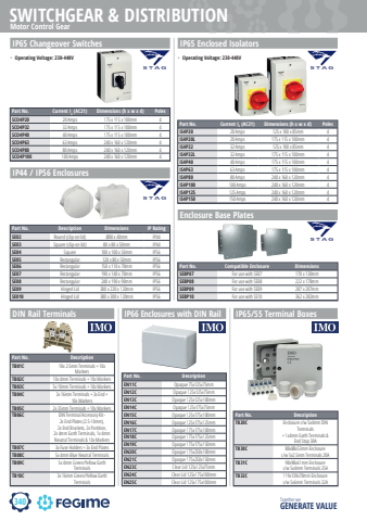 340SWITCHGEAR & DISTRIBUTIONTogether we GENERATE VALUEimoMotor Control GearIP65 Changeover Switches%u2022 Operating Voltage: 230-440VIP65 Enclosed Isolators%u2022 Operating Voltage: 230-440VEnclosure Base PlatesIP44 / IP56 EnclosuresPart No. Current Ie (AC21) Dimensions (h x w x d) PolesSCO4P20 20 Amps 175 x 115 x 100mm 4SCO4P32 32 Amps 175 x 115 x 100mm 4SCO4P40 40 Amps 175 x 115 x 100mm 4SCO4P63 63 Amps 240 x 160 x 120mm 4SCO4P80 80 Amps 240 x 160 x 120mm 4SCO4P100 100 Amps 240 x 160 x 120mm 4Part No. Current Ie (AC21) Dimensions (h x w x d) PolesIS4P20 20 Amps 125 x 100 x 85mm 4IS4P20L 20 Amps 175 x 115 x 100mm 4IS4P32 32 Amps 125 x 100 x 85mm 4IS4P32L 32 Amps 175 x 115 x 100mm 4IS4P40 40 Amps 175 x 115 x 100mm 4IS4P63 63 Amps 175 x 115 x 100mm 4IS4P80 80 Amps 240 x 160 x 120mm 4IS4P100 100 Amps 240 x 160 x 120mm 4IS4P125 125 Amps 240 x 160 x 120mm 4IS4P150 150 Amps 240 x 160 x 120mm 4Part No. Compatible Enclosure DimensionsSEBP07 For use with SE07 170 x 130mmSEBP08 For use with SE08 222 x 178mmSEBP09 For use with SE09 287 x 207mmSEBP10 For use with SE10 362 x 282mmPart No. Description Dimensions IP RatingSE02 Round (clip-on lid) %u00d880 x 40mm IP44SE03 Square (clip-on lid) 80 x 80 x 50mm IP44SE04 Square 100 x 100 x 50mm IP56SE05 Rectangular 120 x 80 x 50mm IP56SE06 Rectangular 150 x 110 x 70mm IP56SE07 Rectangular 190 x 140 x 70mm IP56SE08 Rectangular 240 x 190 x 90mm IP56SE09 Hinged Lid 300 x 220 x 120mm IP56SE010 Hinged Lid 380 x 300 x 120mm IP56Part No. DescriptionTB01C 10x 2.5mm Terminals + 10x MarkersTB02C 10x 4mm Terminals + 10x MarkersTB03C 5x 10mm Terminals + 10x MarkersTB04C 3x 16mm Terminals + 3x End + 10x MarkersTB05C 2x 35mm Terminals + 10x MarkersTB06C DIN Terminal Accessory Kit -2x End Plates (2.5-10mm),2x End Brackets, 2x Partition,2x 4mm Earth Terminals, 1x 4mmNeutral Terminals & 10x MarkersTB07C 3x Fuse Holders + 3x End PlatesTB08C 5x 4mm Blue Neutral TerminalsTB09C 5x 4mm Green/Yellow EarthTerminalsTB10C 3x 16mm Green/Yellow EarthTerminalsPart No. DescriptionEN11C Opaque 75x125x75mmEN12C Opaque 125x125x75mmEN13C Opaque 125x125x100mmEN14C Opaque 125x175x75mmEN15C Opaque 125x175x100mmEN16C Opaque 125x175x125mmEN17C Opaque 175x175x100mmEN18C Opaque 175x175x125mmEN19C Opaque 175x175x150mmEN20C Opaque 175x250x100mmEN21C Opaque 175x250x150mmEN23C Clear Lid 125x125x75mmEN24C Clear Lid 125x175x100mmEN25C Clear Lid 125x175x100mmPart No. DescriptionTB20C Enclosure c/w 5x4mm DIN Terminals+ 1x4mm Earth Terminals &End Stop 30ATB30C 88x88x53mm Enclosurec/w 5x2.5mm Terminals 20ATB31C 98x98x61mm Enclosurec/w 5x4mm Terminals 25ATB32C 119x139x70mm Enclosurec/w 5x6mm Terminals 32ADIN Rail Terminals IP66 Enclosures with DIN Rail IP65/55 Terminal Boxes