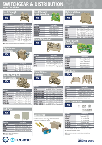 342SWITCHGEAR & DISTRIBUTIONTogether we GENERATE VALUEFeed-Through TerminalsDouble Deck PushFit TerminalsEnd PlatesFeed-Through Earth TerminalsHigh-Insulation TerminalsPush Fit Earth TerminalsEnd BracketsCross ConnectionsPush Fit TerminalsPush Fit Fuse TerminalsHigh Current TerminalsPart No. DescriptionER2.5 2.5mm2 750V 24 Amp (100pcs/pack)ER4 4mm2 750V 32 Amp (100pcs/pack)ER6 6mm2 630V 41 Amp (100pcs/pack)ER10 10mm2 630V 57 Amp (100pcs/pack)ER16 16mm2 750V 76 Amp (50pcs/pack)ER16P 16mm2 750V 76 Amp (50pcs/pack)ER25P 25mm2 750V 101 Amp (50pcs/pack)ER35P 35mm2 750V 125 Amp (50pcs/pack)Part No. DescriptionPFD2.5 2.5mm2 500V 24 Amp (40pcs/pack)PFD2.5V 2.5mm2 500V 24 Amp (40pcs/pack)PFD2.5LD-24VDC 2.5mm2 24VDC 24 Amp (40pcs/pack)PFD2.5LD-220VAC 2.5mm2 220V 24 Amp (40pcs/pack)PFD2.5D 2.5mm2 500V 24 Amp (40pcs/pack)PFD2.5DR 2.5mm2 500V 24 Amp (40pcs/pack)Part No. DescriptionEP2.5-10 Polyamide 66 For Use With ER2.5 - ER10EP16 Polyamide 66 For Use With ER16EP25P Polyamide 66 For Use With ER25PEP50 Polyamide 66 For Use With ER50 - ER240Part No. DescriptionERPE2.5P 2.5mm2 (50pcs/pack)ERPE2.5/4 4mm2 (50pcs/pack)ERPE6/10 6mm2 (25pcs/pack)ERPE16P 16mm2 (25pcs/pack)ERPE35P 35mm2 (1pc/pack)Part No. DescriptionER50 50mm2 1000V 150 Amp (25pcs/pack)ER70 70mm2 1000V 192 Amp (10pcs/pack)ER95 95mm2 1000V 232 Amp (6pcs/pack)ER150 150mm2 1000V 309 Amp (4pcs/pack)ER240 240mm2 1000V 415 Amp (4pcs/pack)Part No. DescriptionPFPE1.5P 1.5mm2 (100pcs/pack)PFPE2.5P 2.5mm2 (50pcs/pack)PFPE4P 4mm2 (50pcs/pack)PFPE6P 6mm2 (60pcs/pack)PFPE10P 10mm2 (25pcs/pack)Part No. DescriptionES1 Screw Type for MR35 RailES3 Screw Type for MR32 & MR35 RailES4 Screwless Type for MR35 RailES6 Screw Type for MR35 RailPart No. DescriptionCC2.5/10* For use with ER2.5CC4/10* For use with ER4CC6/10* For use with ER6CC10/10* For use with ER10CC16/10* For use with ER16, ER16P & ER25CC35/10* For use with ER35Part No. DescriptionPF1.5 1.5mm2 800V 17.5 Amp (100pcs/pack)PF2.5 2.5mm2 800V 24 Amp (100pcs/pack)PF4 4mm2 800V 32 Amp (100pcs/pack)PF6 6mm2 800V 41 Amp (100pcs/pack)PF10 10mm2 800V 57 Amp (50pcs/pack)Part No. DescriptionPFF4 4mm2 500V 10 Amp (15pcs/pack)PFF4LD520-24VDC 4mm2 24VDC 10 Amp (15pcs/pack)PFF4LD520-220VAC 4mm2 220V 10 Amp (15pcs/pack)PFF4LD525-24VDC 4mm2 24VDC 10 Amp (15pcs/pack)PFF4LD525-220VAC 4mm2 220V 10 Amp (15pcs/pack)PFF3 4mm2 500V 10 Amp (15pcs/pack)PFF3LD-24VDC 4mm2 24VDC 10 Amp (15pcs/pack)PFF3LD-220VAC 4mm2 220V 10 Amp (15pcs/pack)Part No. DescriptionERB95 95mm2 1000V 232 Amp (4pcs/pack)ERB150 150mm2 1000V 309 Amp (4pcs/pack)ERB240 240mm2 1000V 415 Amp (4pcs/pack)NOTE: When ordering, please specify the colour required. i.e. ER2.5BLUENOTE: Sold in Pack of 100 Pieces (EP50 Sold in Pack of 10 Pieces)NOTE: Sold in Pack of 100 Pieces (ES6 Sold in Pack of 50 Pieces)* Available in 2, 3, 4 & 10 confi gurations. Replace/10 at the end of the part number with the number required.NOTE: Cross connections can be broken down into virtually any confi guration.AccessoriesIMO manufacture an entire range of DIN Rail terminal accessories. Available upon requestMotor Control Gear