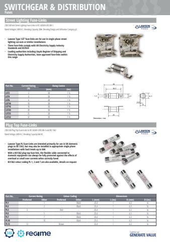 346SWITCHGEAR & DISTRIBUTIONTogether we GENERATE VALUElawson fuses limitedStreet Lighting Fuse-LinksPart No. Current Rating (A)Fixing Centre(mm) (ins)LST2 2 38 1 %u00bdLST4 4 38 1 %u00bdLST6 6 38 1 %u00bdLST10 10 38 1 %u00bdLST16 16 38 1 %u00bdLST20 20 38 1 %u00bdLST25 25 38 1 %u00bdLST32 32 38 1 %u00bdFuses%u2022 Lawson Type %u2018LST%u2019 fuse-links are for use in single-phase street lighting cut-outs or similar installations%u2022 These fuse-links comply with UK Electricity Supply Industry Standards and BS7654%u2022 Leading authorities including Lloyds Register of Shipping and Electricity Supply Authorities, have approved fuse-links within this range230/240 Volt Street Lighting Fuse-Links to IEC 60269-I/BS 88-1.Rated Voltages 240V A.C. Breaking Capacity 20kA. Breaking Range and Utilisation Category gGPlug Top Fuse-LinksPart No. Current Rating Colour Coding DimensionsPreferred Other Preferred Other L (mm) L (ins) D (mm) D (ins)PL1 - 1 - Black 25.4 1 6.3 %u00bcPL2 - 2 - Black 25.4 1 6.3 %u00bcPL3 3 - Red - 25.4 1 6.3 %u00bcPL5 - 5 - Black 25.4 1 6.3 %u00bcPL7 - 7 - Black 25.4 1 6.3 %u00bcPL10 - 10 - Black 25.4 1 6.3 %u00bcPL13 13 - Brown - 25.4 1 6.3 %u00bc%u2022 Lawson Type PL Fuse-Links are intended primarily for use in UK domestic plugs to BS 1363, but may also be installed in appropriate single phase installations with fault levels up to 6kA%u2022 With a BS1362 plug top fuse-link, the flexible cable connected to domestic equipment can always be fully protected against the effects of overload or small over currents when correctly fused%u2022 BS1362 colour coding PL 1, 2 and 7 are also available, details on request230/240 Plug Top Fuse-Links to IEC 60269-3/BS 88-3 and BS 1362Rated Voltage 240V A.C. Breaking Capacity 6kA AC