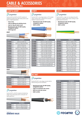 35CABLE & ACCESSORIESTogether we GENERATE VALUETwin & EarthTwin and EarthprysmianStandard Building Wire6242Y & 6243Y%u2022 Easy to strip%u2022 Ideal for lighting and switching circuits%u2022 Ideal for ring and radial circuits %u2022 Manufactured under ISO 9001 Quality management systems%u2022 BASEC ApprovedPart No. Description20144916 6242Y 2x1.0 100m Grey20144904 6242Y 2x1.0 100m Brown Brown20144915 6242Y 2x1.0 50m Grey20144942 6242Y 2x1.5 100m Grey20144920 6242Y 2x1.5 100m Brown Brown20144940 6242Y 2x1.5 50m Grey20147748 6242Y 2x2.5 100m Grey20144955 6242Y 2x2.5 50m Grey20147717 6242Y 2x4.0 100m Grey20145139 6242Y 2x4.0 50m Grey20145162 6242Y 2x6.0 100m Grey20145159 6242Y 2x6.0 50m Grey20147035 6242Y 2x10 100m Grey20147033 6242Y 2x10 50m Grey20147043 6242Y 2x16 100m Grey20147041 6242Y 2x16 50m GreyPrysmian 6242Y and 6243Y are fl at PVC insulated and sheathed low voltage wiring cables ideally suited to small power and lighting applicationsPart No. Description20144893 6241Y 1x1.0 100m Grey Brown20144895 6241Y 1x1.5 100m Grey Brown20147572 6241Y 1x1.5 100m Grey BluePrysmian 6241Y is a fl at PVC insulated and sheathed low voltage wiring cable typically used for small power and lighting applications.6181Y%u2022 Manufactured under ISO 9001 Quality management systems%u2022 BASEC certifiedPrysmian 6181Y is a low voltage single core, PVC insulated copper conductor with an additional PVC oversheath insulation%u00a0for physical protection.6491X%u2022 Manufactured under ISO 9001 Quality management systems%u2022 BASEC certifiedPrysmian 6491X is a single core, low voltage wiring cable designed for installation within conduit, trunking or inside fi xed protected environments. Part No. Description20144882 6181Y 1x1.5 100m Grey Brown20144878 6181Y 1x1.5 100m Grey Blue20146955 6181Y 1x16 100m Grey Brown20146945 6181Y 1x16 100m Grey Blue20146953 6181Y 1x16 50m Grey Brown20146943 6181Y 1x16 50m Grey Blue20146978 6181Y 1x25 100m Grey Brown20146974 6181Y 1x25 100m Grey Blue20146977 6181Y 1x25 50m Grey Brown20146973 6181Y 1x25 50m Grey Blue20352611 2x1x25 (19) 6181Y+16 6491X Tail Pack 1m20362508 2x1x25 (19) 6181Y+16 6491X Tail Pack 2m20352614 2x1x25 (19) 6181Y+16 6491X Tail Pack 3m20352520 25 (19STR) 6181Y Brown(BN) RL5020352601 25 (19STR) 6181Y Blue(BU) RL50Part No. Description20145121 6491X 1x1.5 100m Grn/Ylw20145125 6491X 1x1.5 100m Brown20144859 6491X SOL 1x1.5 100m Blue20147718 6491X 1x2.5 100m Grn/Ylw20145178 6491X 1x2.5 100m Brown20145184 6491X 1x2.5 100m Blue20147719 6491X 1x4.0 100m Grn/Ylw20145219 6491X 1x4.0 100m Brown20145228 6491X 1x4.0 100m Blue20147720 6491X 1x6.0 100m Grn/Ylw20145270 6491X 1x6.0 100m Brown20145277 6491X 1x6.0 100m Blue20147721 6491X 1x10 100m Grn/Ylw20147020 6491X 1x10 50m Grn/Ylw20147722 6491X 1x16 100m Grn/Ylw20147046 6491X 1x16 50m Grn/Ylw20147725 6491X 1x25 Cut Grn/Ylw20145587 6491X 1x35 Cut Grn/Ylw6242Y6243YPart No. Description20144972 6243Y 3x1.0 100m Grey20144971 6243Y 3x1.0 50m Grey20144976 6243Y 3x1.5 100m Grey20144975 6243Y 3x1.5 50m Grey6241YBS 5467%u2022 Manufactured under ISO 9001 Quality management systems%u2022 Single core aluminium wire armour%u2022 Multi core steel wire armour%u2022 BASEC certifiedPart No. Description20145288 BS5467 3x1.5 Cut Black20145297 BS5467 3x2.5 Cut Black20145302 BS5467 3x4.0 Cut Black20145306 BS5467 3x6.0 Cut Black20146869 BS5467 3x10 Cut Black20146877 BS5467 3x16 Cut Black20147291 BS5467 3x25 Cut Black20147295 BS5467 3x35 Cut Black20145035 BS5467 4x1.5 Cut Black20145046 BS5467 4x2.5 Cut Black20145060 BS5467 4x4.0 Cut Black20145071 BS5467 4x6.0 Cut Black20146909 BS5467 4x10 Cut Black20146911 BS5467 4x16 Cut Black20147281 BS5467 4x25 Cut Black20147296 BS5467 4x35 Cut BlackPrysmian BS 5467 is a low voltage armoured cable for industrial wiring and mains distribution.