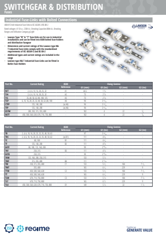 350SWITCHGEAR & DISTRIBUTIONTogether we GENERATE VALUEFusesIndustrial Fuse-Links with Bolted ConnectionsPart No. Current Rating BS88 ReferenceFixing CentresG1 (mm) G1 (ins) G2 (mm) G2 (ins)NIT 2, 4, 6, 10, 16, 20, 25, 32 A1 44.5 1 3/4 - -TIA 2, 4, 6, 10, 16, 20, 25, 32 A2 73 2 7/8 - -TIS 35, 40, 50, 63, 80, 100, 125 A3 73 2 7/8 - -TCP 6, 10, 16, 20, 25, 32, 40, 50, 63 ,80, 100 A4 94 3 11/16 - -CTFP 125, 160, 200 (as A4) 94 3 11/16 - -TFP 125, 160, 200 (as A4) 94 3 11/16 - --85TM 200, 250, 315, 355, 400 - 102 4 22 7/886TT 450, 500, 560, 630, 670, 710, 750, 800 - 102 4 22 7/8%u2022 Lawson Type %u201cN%u201d & %u201cT%u201d fuse-links are for use in industrial installations and can be fitted into 8S88 bolted fuse-holders and distribution fusegear%u2022 Dimensions and current ratings of the Lawson type N& T Industrial Fuse-Links comply with the standardized requirements of IEC 60269-2 and BS 88-2%u2022 Additional types and current ratings are included in the range%u2022 Lawson type N& T Industrial Fuse-Links can be fitted in Boltin Fuse-Holders400/415 Volt Industrial Fuse-links to IEC 60269-2/BS 88-2 Rated voltages: 41 SV a.c. 250V d.c. Breaking Capacities 80kA d.c. Breaking Ranges and Utilisation Category gG/gMPart No. Current Rating BS88 ReferenceFixing CentresG1 (mm) G1 (ins) G2 (mm) G2 (ins)TB 2, 4, 6, 10, 16, 20, 25, 32, 35, 40, 50, 63 - 97 3 13/16 - -TBC 2, 4, 6, 10, 16, 20, 25, 32, 35, 40, 50, 63 (as B1) 111 4 3/8 - -TC 80, 100 B1 111 4 3/8 - -TF 125, 160, 200 B2 111 4 3/8 - -84TF 80, 100, 125, 160, 200 - 99 3 29/32 - -TKF 250, 315 B3 111 4 3/8 - -84TK 250, 315 - 99 3 29/32 - -TKM 125, 160, 200, 250, 315 - 133 5 1/4 - -TMF 315, 355, 400 B4 111 3 11/16 - -TM 250, 315, 355, 400 C1 133 5 1/4 184 7 1/4TMT 355, 400 - 165 6 1/2 229 9TTM 450, 500, 560, 630 C2 133 5 1/4 184 7 1/4TT 450, 500, 560, 630 - 165 6 1/2 229 9TLM 670, 710, 750, 800 C3 133 5 1/4 184 7 1/4TLT 670, 710, 750, 800 - 165 6 1/2 229 9TLU 450, 500, 560, 630, 670, 710, 750, 800 D1 149 5 1/4 32 1 1/4