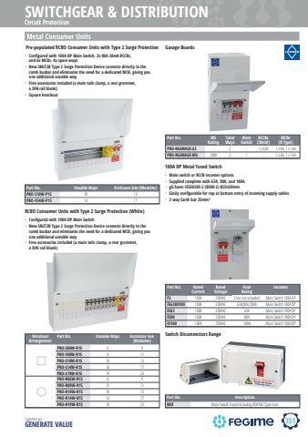 351SWITCHGEAR & DISTRIBUTIONTogether we GENERATE VALUElewdenCircuit ProtectionMetal Consumer Units Pre-populated RCBO Consumer Units with Type 2 Surge ProtectionRCBO Consumer Units with Type 2 Surge Protection (White)100A DP Metal Fused SwitchPart No. MS RatingTotal WaysMain SwitchRCCBs (30mA)MCBs (B Type)PRO-RGARAGE-63 - 2 - 1 x 63A 1 x 6A, 1 x 16APRO-RGARAGE-MS 100A 2 1 - 1 x 6A, 1 x 16AGarage BoardsPart No. DescriptionMSF Main Switch Fused including 80A ME Type FuseSwitch Disconnectors Range Knockout ArrangementPart No. Useable Ways Enclosure Size (Modules) PRO-S06W-R1S 6 9PRO-S08W-R1S 8 11PRO-S10W-R1S 10 13PRO-S14W-R1S 14 17PRO-S19W-R1S 19 22PRO-R06W-R1S 6 9PRO-R08W-R1S 8 11PRO-R10W-R1S 10 13PRO-R14W-R1S 14 17PRO-R19W-R1S 19 22Part No. Useable Ways Enclosure Size (Modules) PRO-S10W-P1S 10 13PRO-S14W-P1S 14 17Part No. Rated Current Rated Voltage Fuse Rating IncomerFS 100A 230VAC Fuse not included Main Switch 100A DPFS6380100 100A 230VAC 63A,80A,100A Main Switch 100A DPFS63 100A 230VAC 63A Main Switch 100A DPFS80 100A 230VAC 80A Main Switch 100A DPFS100 100A 230VAC 100A Main Switch 100A DP%u2022 Configured with 100A DP Main Switch, 2x 80A 30mA RCCBs, and 6x MCBs, 4x spare ways%u2022 New SRGT2B Type 2 Surge Protection Device connects directly to the comb busbar and eliminates the need for a dedicated MCB, giving you one additional useable way%u2022 Free accessories included (a main tails clamp, a rear grommet,a DIN rail blank)%u2022 Square knockout%u2022 Main switch or RCCB incomer options %u2022 Supplied complete with 63A, 80A, and 100A%u2022 gG fuses IEC60269-2 (BS88-2) %u00d822x58mm %u2022 Easily configurable for top or bottom entry of incoming supply cables %u2022 3 way Earth bar 25mm%u00b2%u2022 Configured with 100A DP Main Switch %u2022 New SRGT2B Type 2 Surge Protection Device connects directly to the comb busbar and eliminates the need for a dedicated MCB, giving you one additional useable way %u2022 Free accessories included (a main tails clamp, a rear grommet, a DIN rail blank)