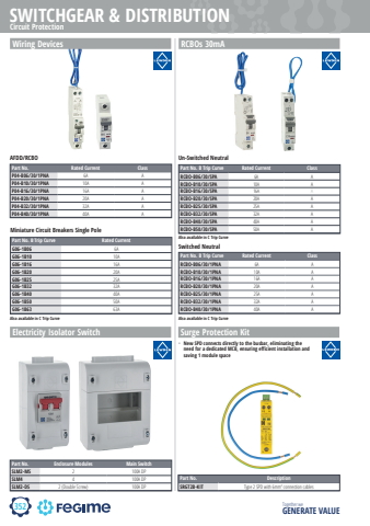 352SWITCHGEAR & DISTRIBUTIONTogether we GENERATE VALUECircuit ProtectionRCBOs 30mAPart No. B Trip Curve Rated Current ClassRCBO-B06/30/SPA 6A ARCBO-B10/30/SPA 10A ARCBO-B16/30/SPA 16A ARCBO-B20/30/SPA 20A ARCBO-B25/30/SPA 25A ARCBO-B32/30/SPA 32A ARCBO-B40/30/SPA 40A ARCBO-B50/30/SPA 50A AAlso available in C Trip CurvePart No. B Trip Curve Rated Current ClassRCBO-B06/30/1PNA 6A ARCBO-B10/30/1PNA 10A ARCBO-B16/30/1PNA 16A ARCBO-B20/30/1PNA 20A ARCBO-B25/30/1PNA 25A ARCBO-B32/30/1PNA 32A ARCBO-B40/30/1PNA 40A AAlso available in C Trip CurvePart No. DescriptionSRGT2B-KIT Type 2 SPD with 6mm2 connection cables Surge Protection KitPart No. Enclosure Modules Main SwitchSLM2-MS 2 100A DPSLM4 4 100A DPSLM2-DS 2 (Double Screw) 100A DPElectricity Isolator Switch%u2022 New SPD connects directly to the busbar, eliminating the need for a dedicated MCB, ensuring efficient installation and saving 1 module spaceUn-Switched NeutralSwitched Neutral Part No. B Trip Curve Rated CurrentG06-1B06 6AG06-1B10 10AG06-1B16 16AG06-1B20 20AG06-1B25 25AG06-1B32 32AG06-1B40 40AG06-1B50 50AG06-1B63 63AMiniature Circuit Breakers Single PoleAlso available in C Trip CurvePart No. Rated Current ClassP04-B06/30/1PNA 6A AP04-B10/30/1PNA 10A AP04-B16/30/1PNA 16A AP04-B20/30/1PNA 20A AP04-B32/30/1PNA 32A AP04-B40/30/1PNA 40A AAFDD/RCBOWiring Devices