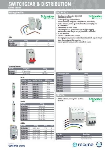 357SWITCHGEAR & DISTRIBUTIONTogether we GENERATE VALUEWiring Devices%u2022 Manufactured and tested to BS EN 61009 10kA breaking capacity%u2022 Let through energy classification of 3 (lowest let through energy best cable protection classification)%u2022 Positive contact indication (guaranteed on/off indication) Trip free MCB mechanism%u2022 Automatic trip on loss of neutral%u2022 Automatic protection against reverse polarity Type C tripping characteristics (5ln to 10ln) 6 - 45A; 10, 30 & 100mA sensitivities%u2022 AC class sensitivity%u2022 For use in LoadCentre A and B boards%u2022 One single pole way occupied in a distribution board Cable capacity 16mm2%u2022 Speed of connection of plug on devices%u2022 Assured system integrity, no other devices fit KQ boardsiKQ RCBO%u2019sPart No. DescriptionSEBLKITT2* Three phase KQ SPD KitSE17BES KQ B board extensionCode Sensivity 30mA RatingSEE106C03 6A 10kASEE110C03 10A 10kASEE116C03 16A 10kASEE120C03 20A 10kASEE125C03 25A 10kASEE132C03 32A 10kASEE140C03 40A 10kASEE145C03 45A 10kA%u2022 SE17BES extension box suggested for fitting of SPD kitSPD KitWiring DevicesPart No. Description RatingEZ9S16291 DP Switch Isolator 100AEZ9R46291 DP Type A RCD 100A 30mAPart No. Rating Type KitEZ9L33620 20kA 2 NoEZ9L33620KIT 20kA 2 YesPart No. Rating Poles CurveEZ9TDA7606 6A 6kA - 30mA 1P+N BEZ9TDA7610 10A 6kA - 30mA 1P+N BEZ9TDA7616 16A 6kA - 30mA 1P+N BEZ9TDA7620 20A 6kA - 30mA 1P+N BEZ9TDA7632 32A 6kA - 30mA 1P+N BEZ9TDA7640 40A 6kA - 30mA 1P+N BPart No. RatingEZ9D16806 6A 6kA 30mAEZ9D16810 10A 6kA 30mAEZ9D16816 16A 6kA 30mAEZ9D16820 20A 6kA 30mAEZ9D16832 32A 6kA 30mAEZ9D16840 40A 6kA 30mAEZ9D16850 50A 6kA 30mAPart No. B Curve Part No. C Curve MCB RatingEZ9F16103 - 3A 6kAEZ9F16106 EZ9F66106 6A 6kAEZ9F16110 EZ9F66110 10A 6kAEZ9F16116 EZ9F66116 16A 6kAEZ9F16120 EZ9F66120 20A 6kAEZ9F16132 EZ9F66132 32A 6kAEZ9F16140 EZ9F66140 40A 6kAEZ9F16150 EZ9F66150 50A 6kAAFDDsRCBOsMCBsIncoming DevicesSPDs