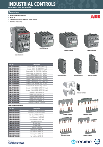 363INDUSTRIAL CONTROLSTogether we GENERATE VALUEContactors and Accessories%u2022 Wide Range Electronic coils %u2022 AC or DC %u2022 3 Pole contactors for Motors or Power circuits%u2022 Common Accessories ContactorsPart No. Description1SBL137001R1101 Contactor 4kW 24-60V AC/DC (1 N/C Aux)1SBL137001R1110 Contactor 4kW 24-60V AC/DC (1 N/O Aux)1SBL137001R1301 Contactor 4kW 100-250V AC/DC (1 N/C Aux)1SBL137001R1310 Contactor 4kW 100-250V AC/DC (1 N/O Aux)1SBL157001R1101 Contactor 5.5kW 24-60V AC/DC (1 N/C Aux)1SBL157001R1110 Contactor 5.5kW 24-60V AC/DC (1 N/O Aux)1SBL157001R1301 Contactor 5.5kW 100-250V AC/DC (1 N/C Aux)1SBL157001R1310 Contactor 5.5kW 100-250V AC/DC (1 N/O Aux)1SBL177001R1101 Contactor 7.5kW 24-60V AC/DC (1 N/C Aux)1SBL177001R1110 Contactor 7.5kW 24-60V AC/DC (1 N/O Aux)1SBL177001R1301 Contactor 7.5kW 100-250V AC/DC (1 N/C Aux)1SBL177001R1310 Contactor 7.5kW 100-250V AC/DC (1 N/O Aux)1SBL237001R1100 Contactor 11kW 24-60V AC/DC1SBL237001R1300 Contactor 11kW 100-250V AC/DC1SBL277001R1100 Contactor 15kW 24-60V AC/DC1SBL277001R1300 Contactor 15kW 100-250V AC/DC1SBL297001R1100 Contactor 18.5kW 24-60V AC/DC1SBL297001R1300 Contactor 18.5kW 100-250V AC/DCPart No. Description1SBN010110R1001 Front Mount N/C Auxilliary Contact1SBN010110R1010 Front Mount N/O Auxilliary Contact1SBN010120R1011 Side Mount 1 N/O & 1 N/C Aux1SBN010140R1022 Front Mount Aux 2 N/O 2 N/C1SBN010140R1031 Front Mount Aux 3 N/O 1 N/C1SBN010140R1040 Front Mount Aux 4 N/O1SBN020112R1000 On Delay Timer1SBN020114R1000 Off Delay Timer1SBN030105T1000 Mechanical Interlock1SBN081311R1000 Reversing Link Kit AF09-161SBN081313R2000 Star Delta Link Kit AF09-161SBN082311R1000 Reversing Link Kit AF26-381SBN082713R2000 Star Delta Link Kit AF26-38Contactor Accessories1SBL137001R11101SBN020112R10001SBN020114R1000 1SBN010140R10401SBN010110R1010 1SBN010110R1001 1SBN010120R10111SBN030105T10001SBN081311R1000 1SBN081313R20001SBN082311R1000 1SBN082713R2000