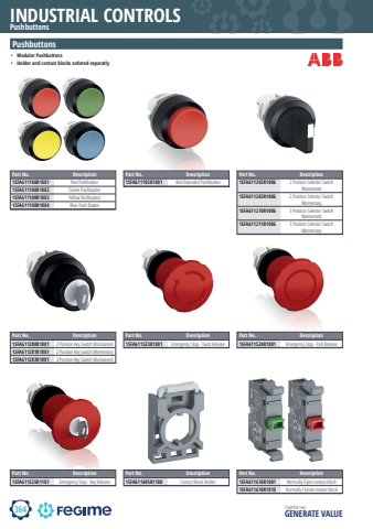 364INDUSTRIAL CONTROLSTogether we GENERATE VALUEPushbuttons%u2022 Modular Pushbuttons %u2022 Holder and contact blocks ordered separatlyPushbuttonsPart No. Description1SFA611100R1001 Red Pushbutton1SFA611100R1002 Green Pushbutton1SFA611100R1003 Yellow Pushbutton1SFA611100R1004 Blue Push ButtonPart No. Description1SFA611102R1001 Red Extended PushbuttonPart No. Description1SFA611202R1006 2 Position Selector Switch Maintained1SFA611203R1006 2 Position Selector Switch Momentary1SFA611210R1006 3 Position Selector Switch Maintained1SFA611211R1006 3 Position Selector Switch MomentaryPart No. Description1SFA611280R1001 2 Position Key Switch Maintained1SFA611281R1001 2 Position Key Switch Momentary1SFA611283R1001 3 Position Key Switch MaintainedPart No. Description1SFA611610R1001 Normally Open contact block1SFA611610R1010 Normally Closed contact blockPart No. Description1SFA611523R1001 Emergency Stop - Twist ReleasePart No. Description1SFA611524R1001 Emergency Stop - Pull ReleasePart No. Description1SFA611525R1101 Emergency Stop - Key ReleasePart No. Description1SFA611605R1100 Contact Block Holder