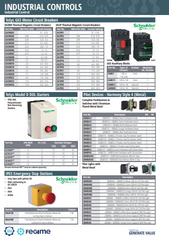 368INDUSTRIAL CONTROLSTogether we GENERATE VALUEIndustrial ControlPart No. 400/415V (kW) Current SettingsGV2ME01 - 0.1 - 0.16GV2ME02 0.06 0.16 - 0.25GV2ME03 0.09 0.25 - 0.4GV2ME04 0.12 0.4 - 0.63GV2ME05 0.25 0.63 - 1.0GV2ME06 0.55 1.0 - 1.6GV2ME07 0.75 1.6 - 2.5GV2ME08 1.1 2.5 - 4.0GV2ME10 2.2 4.0 - 6.3GV2ME14 3.0 6.0 - 10.0GV2ME14 4.0 6.0 - 10.0GV2ME16 5.5 9.0 - 14.0GV2ME20 7.5 13.0 - 18.0GV2ME21 9.0 17.0 - 23.0GV2ME22 11.0 20.0 - 25.0GV2ME32 15.0 24.0 - 32.0Part No. 400/415V (kW) Current SettingsGV2P01 - 0.1 - 0.16GV2P02 0.06 0.16 - 0.25GV2P03 0.09 0.25 - 0.4GV2P04 0.12 0.4 - 0.63GV2P05 0.25 0.63 - 1.0GV2P06 0.55 1.0 - 1.6GV2P07 0.75 1.6 - 2.5GV2P08 1.1 2.5 - 4.0GV2P10 2.2 4.0 - 6.3GV2P14 3.0 6.0 - 10.0GV2P20 7.5 13.0 - 18.0GV2P21 9.0 17.0 - 23.0GV2P22 11.0 20.0 - 25.0GV2P32 15.0 24.0 - 32.0GV3P40 18.5 30.0 - 40.0GV3P50 22.0 37.0 - 50.0GV3P65 30.0 48.0 - 65.0Part No. Types of ContactsPosition Maximum No. PossibleGVAE1 1 NO or 1 NC (rev)Front 1GVAE11 1 NO & 1 NC Front 1GVAN11 1 NO & 1 NC Side (LH) 2GVAN20 1 NO & 1 NC Side (LH) 2GV2 Auxilliary BlocksGV2ME GV2PTeSys GV2 Motor Circuit BreakersGV2ME Thermal Magnetic Circuit Breakers GV2P Thermal Magnetic Circuit BreakersPart No. Description ContactXALK178 1 Red Mushroom Head Pushbutton 40mm dia Latching Twist to Release1 NCXALK188 1 Red Mushroom Head Pushbutton 40mm dia Latching Turn Key to Release1 NC%u2022 Grey base with yellow lid%u2022 IP66 conforming to IEC 60529%u2022 IP67%u2022 IP69%u2022 IP69K%u2022 IP65 DOL Polycarbonate Non-Reversing StartersPart No. 3Ph/400V (kW)AC-3 (A) Standard Voltages110V 230V 400VLE1D09** 4 9 F7 P7 V7LE1D12** 5.5 12 F7 P7 V7LE1D18** 7.5 18 F7 P7 V7LE1D25** 11 25 F7 P7 V7LE1D35** 15 35 F7 P7 V7TeSys Model D DOL StartersIP65 Emergency Stop StationsThermal Overload LRD** must be ordered separately.Pilot Devices - Harmony Style 4 (Metal)Part No. Description NO NCXB4BA21 (ZB4BZ101 + ZB4BA2) Black Pushbutton Head 1 -XB4BA31 (ZB4BZ101 + ZB4BA3) Green Pushbutton Head 1 -XB4BA42 (ZB4BZ102 + ZB4BA4) Red Pushbutton Head - 1XB4BA51 (ZB4BZ101 + ZB4BA5) Orange Pushbutton Head 1 -XB4BA61 (ZB4BZ101 + ZB4BA6) Blue Pushbutton Head 1 -XB4BD21 (ZB4BZ101 + ZB4BD2) 2 Position Stay Put Selector Switch 1 -XB4BD25 (ZB4BZ105 + ZB4BD2) 2 Position Stay Put Selector Switch 1 1XB4BD33 (ZB4BZ103 + ZB4BD3) 3 Position Stay Put Selector Switch 2 -XB4BG21 (ZB4BZ101 + ZB4BG4) 2 Position Stay Put Key Switch 1 -XB4BP31 (ZB4BZ101 + ZB4BP3) Green Pushbutton with Silicone Boot 1 -XB4BP42 (ZB4BZ102 + ZB4BP4) Red Pushbutton with Silicone Boot - 1XB4BS9442 (ZB4BZ102 + ZB4BS944) Key Release 40mm E Stop - 1XB4BS8442 (ZB4BZ102 + ZB4BS844) Twist Release 40mm E Stop - 1Complete Pushbuttons & Switches with Chromium Plated Metal BezelPart No. DescriptionXB4BVM1 (ZB4BVM1 + ZB4BV013) White 230V AC LED Pilot LightXB4BVM3 (ZB4BVM3 + ZB4BV033) Green 230V AC LED Pilot LightXB4BVM4 (ZB4BVM4 + ZB4BV043) Red 230V AC LED Pilot LightXB4BVM5 (ZB4BVM5 + ZB4BV053) Orange 230V AC LED Pilot LightXB4BVM6 (ZB4BVM6 + ZB4BV063) Blue 230V AC LED Pilot LightXB4BVB1 (ZB4BVB1 + ZB4BV013) White 24V AC/DC LED Pilot LightXB4BVB3 (ZB4BVB3 + ZB4BV033) Green 24V AC/DC LED Pilot LightXB4BVB4 (ZB4BVB4 + ZB4BV043) Red 24V AC/DC LED Pilot LightXB4BVB5 (ZB4BVB5 + ZB4BV053) Orange 24V AC/DC LED Pilot LightXB4BV61 (ZB4BV6 + ZB4BV01) White Direct Supply AC BA9 Pilot LightXB4BV63 (ZB4BV6 + ZB4BV03) Green Direct Supply AC BA9 Pilot LightXB4BV64 (ZB4BV6 + ZB4BV04) Red Direct Supply AC BA9 Pilot LightXB4BV65 (ZB4BV6 + ZB4BV05) Orange Direct Supply AC BA9 Pilot LightPilot Lights with Metal Bezel