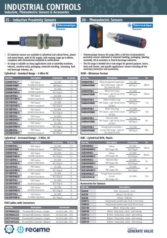 370INDUSTRIAL CONTROLSTogether we GENERATE VALUEInductive, Photoelectric Sensors & Accessories%u2022 XS inductive sensors are available in cylindrical and cubical forms, plastic and metal bezels, with AC/DC supply, with sensing range up to 60mm, compliant with international standards & certifications.%u2022 XS range is suitable on many applications such as assembly machines, robotics, machine-tools, packaging, materials handling, conveying, food and beverage industry, etc.XS - Inductive Proximity SensorsPart No. Description Connection Sn (mm)XS508B1PAL2* PNP Output - N/OM8 Short Barrel2m Cable 1.5XS508B1PAM8 M8 Plug-in 1.5XS508BLPAL2 PNP Output - N/OM8 Long Barrel2m Cable 1.5XS508BLPAM12 M12 Plug-in 1.5XS512B1PAL2 PNP Output - N/OM12 Short Barrel2m Cable 2XS512B1PAM12 M12 Plug-in 2XS512BLPAL2 PNP Output - N/OM12 Long Barrel2m Cable 2XS512BLPAM12 M12 Plug-in 2XS518B1PAL2 PNP Output - N/OM18 Short Barrel2m Cable 5XS518B1PAM12 M12 Plug-in 5XS518BLPAL2 PNP Output - N/OM18 Long Barrel2m Cable 5XS518BLPAM12 M12 Plug-in 5XS530B1PAL2 PNP Output - N/OM30 Short Barrel2m Cable 10XS530B1PAM12 M12 Plug-in 10XS530BLPAL2 PNP Output - N/OM30 Long Barrel2m Cable 10XS530BLPAM12 M12 Plug-in 10Cylindrical - Standard Range %u2013 3-Wire DCPart No. Description Connection Sn (mm)XS108B3PAL2 PNP Output - N/OM8 Short Barrel2m Cable 2.5XS108B3PAM8 M8 Plug-in 2.5XS608B1PAL2 PNP Output - N/OM8 Long Barrel2m Cable 2.5XS608B1PAM12 M12 Plug-in 2.5XS112B3PAL2 PNP Output - N/OM12 Short Barrel2m Cable 4XS112B3PAM12 M12 Plug-in 4XS612B1PAL2 PNP Output - N/OM12 Long Barrel2m Cable 4XS612B1PAM12 M12 Plug-in 4XS118B3PAL2 PNP Output - N/OM18 Short Barrel2m Cable 8XS118B3PAM12 M12 Plug-in 8XS618B1PAL2 PNP Output - N/OM18 Long Barrel2m Cable 8XS618B1PAM12 M12 Plug-in 8XS130B3PAL2 PNP Output - N/OM30 Short Barrel2m Cable 15XS130B3PAM12 M12 Plug-in 15XS630B1PAL2 PNP Output - N/OM30 Long Barrel2m Cable 15XS630B1PAM12 M12 Plug-in 15Cylindrical - Increased Range %u2013 3-Wire, DCPart No. Description ConnectionXZCP0566L2(5) Pre-wired M8 Connector - Straight 2m (5m) Cable - 3 PinXZCP0666L2(5) Pre-wired M8 Connector - Elbowed 2m (5m) Cable - 3 PinXZCP1141L2(5) Pre-wired M12 Connector - Straight 2m (5m) Cable - 4 PinXZCP1241L2(5) Pre-wired M12 Connector - Elbowed 2m (5m) Cable - 4 PinPUR Cables with Connectors%u2022 Telemecanique Sensors XU range offers a full line of photoelectric proximity sensors dedicated to material handling, packaging, labeling, assembly, lift & escalators or food & beverage industries.%u2022 The XU range is divided into 4 sub ranges for general purpose, lasers, forks and frames, and specific applications%u2019 sensors including all the necessary connectors and accessories.XU - Photoelectric SensorsPart No. Description Connection SnXUM8APXBL2 Diff use background suppression (BGS) PNP Output - Light ON (NC)/Dark ON (NO)2m CableXUM8APXBM8 M8 Plug-in 300mmXUM4APXBL2 Diff use short rangePNP Output - Light ON (NC)/Dark ON (NO)2m CableXUM4APXBM8 M8 Plug-in 250mmXUM6APXBL2 Diff use medium rangePNP Output - Light ON (NC)/Dark ON (NO)2m CableXUM6APXBM8 M8 Plug-in 1.1mXUM5APXBL2 Diff use long rangePNP Output - Light ON (NC)/Dark ON (NO)2m CableXUM5APXBM8 M8 Plug-in 1.9mXUM9APXBL2 Polarised refl exPNP Output - Light ON (NC)/Dark ON (NO)2m CableXUM9APXBM8 M8 Plug-in 8mXUM2APXBL2 Through beam transmitter + receiver PNP Output - Light ON (NC)/Dark ON (NO)2m CableXUM2APXBM8 M8 Plug-in 30mXUM %u2013 Miniature FormatPart No. Description Connection SnXUB4APANL2 Diff usePNP Output -NO2m Cable 100mm XUB4APANM12 M12 Plug-inXUB5APANL2 Diff usePNP Output -NO2m Cable 600mm XUB5APANM12 M12 Plug-inXUB9APANL2 Polarised refl exPNP Output -NO2m Cable 2m XUB9APANM12 M12 Plug-inXUB1APANL2 Refl exPNP Output -NO2m Cable 4m XUB1APANM12 M12 Plug-inXUB2AKSNL2T Through beam transmitter + receiverPNP Output -NO XUB2APANL2R 2m Cable 15mXUB %u2013 Cylindrical M18, PlasticPart No. DescriptionXUZA50 XUM - fi xing bracket - metalXUZC50 refl ector - 50 x 50 mmXUZC80 refl ector - %u00d8 80 mmXSZBS12 fi xing bracket, stainless steel, for %u00d8 12 mm sensorXSZBS30 fi xing bracket, stainless steel, for %u00d8 30 mm sensorXSAZ108 %u00d88mm - fi xing clamp - plasticXSZB108 %u00d88mm - fi xing clamp - plastic - with indexingXSZB112 %u00d812mm - fi xing clamp - plastic - with indexingXSZB118 %u00d818mm - fi xing clamp - plastic - with indexingXSZB130 %u00d830mm - fi xing clamp - plastic - with indexingAccessories for Sensors