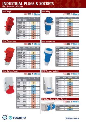372INDUSTRIAL PLUGS & SOCKETSTogether we GENERATE VALUEPlugs, Connectors & SocketsIP44 PlugsScrew Terminal Part No.Quick Connect Part No.Amps Voltage Pins21000-TLS 2125 16 110 321012-TLS 2137 32 110 321001-TLS 2126 16 230 321013-TLS 2138 32 230 32104 - 63 230 321005-TLS 2130 16 400 421017-TLS 2142 32 400 4203-TLS 2136 16 400 5204-TLS 2148 32 400 52155 - 63 400 5IP67 PlugsPart No. Amps Voltage Pins21237 16 110 321408 32 110 321238 16 230 321240 32 230 321349 16 400 421351 32 400 421239 16 400 521241 32 400 52189 63 400 52199 125 400 5IP44 Connectors Screw Terminal Part No.Quick Connect Part No.Amps Voltage Pins31000-TLS 3125 16 110 331012-TLS 3137 32 110 331001-TLS 3126 16 230 331013-TLS 3138 32 230 33104 - 63 230 331005-TLS 3130 16 400 431017-TLS 3142 32 400 4303-TLS 3136 16 400 5304-TLS 3148 32 400 53112 - 63 400 5IP67 ConnectorsPart No. Amps Voltage Pins31298 16 110 331307 32 110 331240 16 230 331244 32 230 331241 16 400 431245 32 400 431243 16 400 531247 32 400 53124 63 400 53199 125 400 5IP44 Surface SocketsScrew Terminal Part No.Quick ConnectPart No.Amps Voltage Pins11302 11912 16 110 311310 11948 32 110 311304 11895 16 230 311312 11919 (External Fixings)32 230 311949 32 230 31104 - 63 230 311306 11905 16 400 411314 11956 32 400 41127 - 63 400 411308 112001 16 400 511316 112002 (External Fixings)32 400 511962 32 400 51124 - 63 400 5IP67 Surface SocketsPart No. Amps Voltage Pins1132 16 110 31144 32 110 31133 16 230 31145 32 230 31137 16 400 41149 32 400 41143 16 400 51155 32 400 51112 63 400 511447 125 400 5Part No. Amps Voltage Pins653240 16 110 3653241 16 230 3IP44 Two Gang Surface Sockets