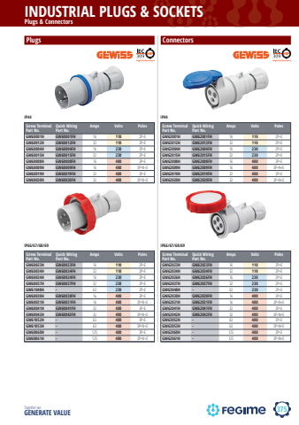 375INDUSTRIAL PLUGS & SOCKETSTogether we GENERATE VALUEgewissPlugs & ConnectorsPlugsIP44Screw TerminalPart No.Quick WiringPart No.Amps Volts PolesGW60001H GW60001FH 16 110 2P+EGW60012H GW60012FH 32 110 2P+EGW60004H GW60004FH 16 230 2P+EGW60015H GW60015FH 32 230 2P+EGW60008H GW60008FH 16 400 3P+EGW60009H GW60009FH 16 400 3P+N+EGW60019H GW60019FH 32 400 3P+EGW60020H GW60020FH 32 400 3P+N+EIP66/67/68/69Screw TerminalPart No.Quick WiringPart No.Amps Volts PolesGW60023H GW60023FH 16 110 2P+EGW60034H GW60034FH 32 110 2P+EGW60024H GW60024FH 16 230 2P+EGW60037H GW60037FH 32 230 2P+EGW61048H - 63 230 2P+EGW60030H GW60030FH 16 400 3P+EGW60031H GW60031FH 16 400 3P+N+EGW60041H GW60041FH 32 400 3P+EGW60042H GW60042FH 32 400 3P+N+EGW61052H - 63 400 3P+EGW61053H - 63 400 3P+N+EGW60060H - 125 400 3P+EGW60061H - 125 400 3P+N+EConnectorsIP44Screw TerminalPart No.Quick WiringPart No.Amps Volts PolesGW62001H GW62001FH 16 110 2P+EGW62012H GW62012FH 32 110 2P+EGW62004H GW62004FH 16 230 2P+EGW62015H GW62015FH 32 230 2P+EGW62008H GW62008FH 16 400 3P+EGW62009H GW62009FH 16 400 3P+N+EGW62019H GW62019FH 32 400 3P+EGW62020H GW62020FH 32 400 3P+N+EIP66/67/68/69Screw TerminalPart No.Quick WiringPart No.Amps Volts PolesGW62023H GW62023FH 16 110 2P+EGW62034H GW62034FH 32 110 2P+EGW62026H GW62026FH 16 230 2P+EGW62037H GW62037FH 32 230 2P+EGW63048H - 63 230 2P+EGW62030H GW62030FH 16 400 3P+EGW62031H GW62031FH 16 400 3P+N+EGW62041H GW62041FH 32 400 3P+EGW62042H GW62042FH 32 400 3P+N+EGW63052H - 63 400 3P+EGW63053H - 63 400 3P+N+EGW62060H - 125 400 3P+EGW62061H - 125 400 3P+N+E