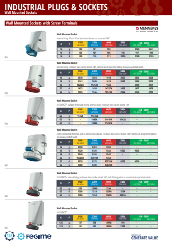 378INDUSTRIAL PLUGS & SOCKETSTogether we GENERATE VALUEmennekesWall Mounted SocketsWall Mounted Sockets with Screw TerminalsA P 110V50A 60Hz 230V50A 60Hz 400V50A 60Hz 500V50A 60Hz 100-300Hz 300-500Hz16 3 100 101 102 - 2169 224116 4 103 104 105 106 107 10816 5 109 110 111 2000 2188 2199>50 - 500VWall Mounted SocketInternal fi xing, 4P and 5P sockets the enclosure can be turned 180%u00baIP44A P 110V50A 60Hz 230V50A 60Hz 400V50A 60Hz 500V50A 60Hz 100-300Hz 300-500Hz16 4 3030 3034 1418 3032 3035 302816 5 3141 3045 1419 3043 3046 303932 3 1420ZA 1421ZA 1422 - 3139 313432 4 1423 1424 1425ZA 1426 1427 142832 5 1555 1556 1557ZA 3152 3154 3149>50 - 500VWall Mounted SocketInternal fi xing, enclosure base can be turned 180%u00ba, sockets are designed for adding an auxiliary contact switchIP44A P 110V50A 60Hz 230V50A 60Hz 400V50A 60Hz 500V50A 60Hz 100-300Hz 300-500Hz63 3 1136A 1137AB - - - -63 4 - 1140A 1141PA 1142A - -63 5 - 1144A 1145PA - - ->50 - 500VWall Mounted SocketX-CONTACT%u00ae, suitable for through wiring, internal fi xing, enclosure base can be turned 180%u00baIP44A P 110V50A 60Hz 230V50A 60Hz 400V50A 60Hz 500V50A 60Hz 100-300Hz 300-500Hz16 3 9300 9301 9302 - - -16 4 9320 9321 9322 9323 9325 -16 5 9340 9341 9342 - - -32 3 9350UK 9351UK 9352 - - -32 4 9370 9371 9372UK 9373 9374 -32 5 9380 9381 9382UK - - -Wall Mounted SocketHighly resistant to chemicals, with 2 external fi xing points, enclosure base can be turned 180%u00ba, sockets are designed for adding an auxiliary contact switchIP67A P 110V50A 60Hz 230V50A 60Hz 400V50A 60Hz 500V50A 60Hz 100-300Hz 300-500Hz63 3 856 128AB 129A - - -63 4 130A 131A 132PA 133A - -63 5 134A 135A 136PA 2007A - ->50 - 500VWall Mounted SocketX-CONTACT%u00ae, internal fi xing, enclosure base can be turned 180%u00ba, with 6 fi xing points to accommodate special terminalsIP67A P 110V50A 60Hz 230V50A 60Hz 400V50A 60Hz 500V50A 60Hz 100-300Hz 300-500Hz125 4 137 138 139AB 140 - -125 5 141 142 143PA 2139 - ->50 - 500VWall Mounted SocketX-CONTACT%u00aeIP67>50 - 500V