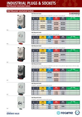 379INDUSTRIAL PLUGS & SOCKETSTogether we GENERATE VALUEWall Mounted Interlocked SocketsIP44A P 110V50A 60Hz 230V50A 60Hz 400V50A 60Hz 500V50A 60Hz 100-300Hz 300-500Hz63 3 - 6571PA - - - -63 4 - 5955A 5956PA 5957A - -63 5 - - 5959PA - - ->50 - 500VWall Mounted SocketX-CONTACT%u00ae, switched with mechanical DUO-interlock, Can be padlockedWall Mounted SocketSwitched with mechanical DUO-interlock, X-CONTACT%u00ae, 3 pole switch, Can be padlockedA P 110V50A 60Hz 230V50A 60Hz 400V50A 60Hz 500V50A 60Hz 100-300Hz 300-500Hz16 3 5601304G 5601306G - - - -16 4 - 5601409G 5601406G 5601407G - -16 5 - - 5601506G 5601507G - -32 3 5603304G 5603306G - - - -32 4 5603404G 5603409G 5603406G 5603407G - -32 5 - 5603509G 5603506G 5603507G - ->50 - 500VWall Mounted Interlocked SocketsIP44IP67Wall Mounted SocketSwitched with mechanical DUO-interlock, X-CONTACT%u00ae, 3 pole switch, Can be padlockedA P 110V50A 60Hz 230V50A 60Hz 400V50A 60Hz 500V50A 60Hz 100-300Hz 300-500Hz16 3 5602304G 5602306G - - - -16 4 - 5602409G 5602406G 5602407G - -16 5 - 5602509G 5602506G - - -32 3 5604304G 5604306G - - - -32 4 - 5604409G 5604406G 5604407G - -32 5 - 5604509G 5604506G - - ->50 - 500VIP67Wall Mounted SocketSwitched with mechanical DUO-interlock, X-CONTACT%u00ae, 3 pole switch, Can be padlocked, Highly resistant to chemicals, Highly heat resistant contact carrier, Nickel plated contactsA P 110V50A 60Hz 230V50A 60Hz 400V50A 60Hz 500V50A 60Hz 100-300Hz 300-500Hz16 3 - 5802306G - - - -16 4 - - 5802406G - - -16 5 - - 5802506G - - -32 3 - 5804306G - - - -32 4 - - 5804406G - - -32 5 - - 5804506G - - ->50 - 500VA P 110V50A 60Hz 230V50A 60Hz 400V50A 60Hz 500V50A 60Hz 100-300Hz 300-500Hz63 3 5925A 5911AB - - - -63 4 - 5109A 5110PA 5111A - -63 5 - 5112A 5113PB 5759A - ->50 - 500VWall Mounted SocketX-CONTACT%u00ae, switched with mechanical DUO-interlockIP67A P 110V50A 60Hz 230V50A 60Hz 400V50A 60Hz 500V50A 60Hz 100-300Hz 300-500Hz125 3 7060 7000 - - - -125 4 - 5887A 5691PF 5690A - -125 5 - 5888A 5692A - - ->50 - 500VWall Mounted SocketX-CONTACT%u00ae, switched with mechanical DUO-interlockIP67