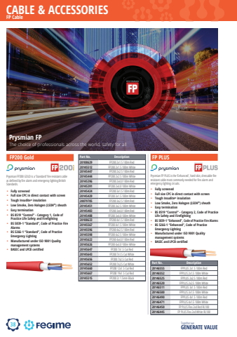 38CABLE & ACCESSORIESTogether we GENERATE VALUEfp200 fp plus fpplusFP Cable FP200 Gold%u2022 Fully screened%u2022 Full size CPC in direct contact with screen %u2022 Tough Insudite%u00ae insulation%u2022 Low Smoke, Zero Halogen (LSOH%u00ae) sheath%u2022 Easy termination%u2022 BS 8519 %u201cControl%u201d - Category 1, Code of Practice Life Safety and Firefighting%u2022 BS 5839-1 %u201cStandard%u201d, Code of Practice Fire Alarms%u2022 BS 5266-1 %u201cStandard%u201d, Code of Practice Emergency Lighting%u2022 Manufactured under ISO 9001 Quality management systems%u2022 BASEC and LPCB certifiedPart No. Description20108629 FP200 2x1.5 100m Red20145512 FP200 2x1.5 100m White20145447 FP200 2x2.5 100m Red20145444 FP200 2x2.5 100m White20145396 FP200 2x4.0 100m Red20145391 FP200 2x4.0 100m White20145424 FP200 3x1.5 100m Red20145429 FP200 3x1.5 100m White20079705 FP200 3x2.5 100m Red20145451 FP200 3x2.5 100m White20145483 FP200 3x4.0 100m Red20145488 FP200 3x4.0 100m White20108633 FP200 4x1.5 100m Red20145567 FP200 4x1.5 100m White20145596 FP200 4x2.5 100m Red20145598 FP200 4x2.5 100m White20145622 FP200 4x4.0 100m Red20145626 FP200 4x4.0 100m White20145647 FP200 7x1.5 Cut Red20145643 FP200 7x1.5 Cut White20145656 FP200 7x2.5 Cut Red20145652 FP200 7x2.5 Cut White20145660 FP200 12x1.5 Cut Red20145667 FP200 19x1.5 Cut Red20145515 FP200 2c 1.5mm BlackPrysmian FP200 GOLD is a %u2018Standard%u2019 fi re resistant cable as defi ned by fi re alarm and emergency lighting British Standards.FP PLUS%u2022 Fully screened%u2022 Full size CPC in direct contact with screen %u2022 Tough Insudite%u00ae insulation%u2022 Low Smoke, Zero Halogen (LSOH%u00ae) sheath%u2022 Easy termination%u2022 BS 8519 %u201cControl%u201d - Category 2, Code of Practice Life Safety and Firefighting%u2022 BS 5839-1 %u201cEnhanced%u201d, Code of Practice Fire Alarms%u2022 BS 5266-1 %u201cEnhanced%u201d, Code of Practice Emergency Lighting%u2022 Manufactured under ISO 9001 Quality management systems%u2022 BASEC and LPCB certifiedPart No. Description20146555 FPPLUS 2x1.5 100m Red20146552 FPPLUS 2x1.5 100m White20146525 FPPLUS 2x2.5 100m Red20146520 FPPLUS 2x2.5 100m White20146511 FPPLUS 3x1.5 100m Red20146500 FPPLUS 3x1.5 100m White20146490 FPPLUS 4x1.5 100m Red20146471 FPPLUS 4x1.5 100m White20146450 FP PLUS Flex 2x4 Red RL10020146445 FP PLUS Flex 2x4 White RL100Prysmian FP PLUS is the %u2018Enhanced%u2019, hard skin, dressable fi re resistant cable most commonly needed for fi re alarm and emergency lighting circuits.Prysmian FPThe choice of professionals across the world, safety for all