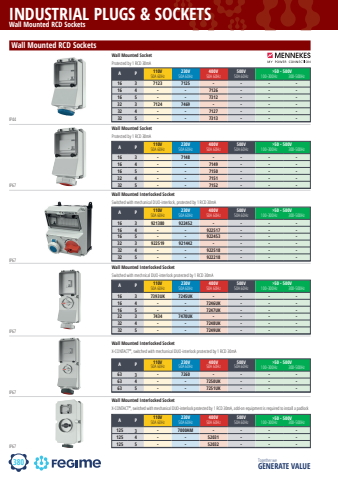 380INDUSTRIAL PLUGS & SOCKETSTogether we GENERATE VALUEWall Mounted RCD SocketsIP44Wall Mounted SocketProtected by 1 RCD 30mAWall Mounted SocketProtected by 1 RCD 30mAA P 110V50A 60Hz 230V50A 60Hz 400V50A 60Hz 500V50A 60Hz 100-300Hz 300-500Hz16 3 7123 7125 - - - -16 4 - - 7126 - - -16 5 - - 7312 - - -32 3 7124 7469 - - - -32 4 - - 7127 - - -32 5 - - 7313 - - ->50 - 500VWall Mounted RCD SocketsIP67IP67Wall Mounted Interlocked SocketSwitched with mechanical DUO-interlock, protected by 1 RCD 30mAA P 110V50A 60Hz 230V50A 60Hz 400V50A 60Hz 500V50A 60Hz 100-300Hz 300-500Hz16 3 921380 922452 - - - -16 4 - - 922517 - - -16 5 - - 922453 - - -32 3 922519 921442 - - - -32 4 - - 922518 - - -32 5 - - 922218 - - ->50 - 500VIP67Wall Mounted Interlocked SocketSwitched with mechnical DUO-interlock protected by 1 RCD 30mAA P 110V50A 60Hz 230V50A 60Hz 400V50A 60Hz 500V50A 60Hz 100-300Hz 300-500Hz16 3 7393UK 7245UK - - - -16 4 - - 7246UK - - -16 5 - - 7247UK - - -32 3 7434 7470UK - - - -32 4 - - 7248UK - - -32 5 - - 7249UK - - ->50 - 500VA P 110V50A 60Hz 230V50A 60Hz 400V50A 60Hz 500V50A 60Hz 100-300Hz 300-500Hz63 3 - 7260 - - - -63 4 - - 7250UK - - -63 5 - - 7251UK - - ->50 - 500VWall Mounted Interlocked SocketX-CONTACT%u00ae, switched with mechanical DUO-interlock protected by 1 RCD 30mAIP67A P 110V50A 60Hz 230V50A 60Hz 400V50A 60Hz 500V50A 60Hz 100-300Hz 300-500Hz125 3 - 7000AM - - - -125 4 - - 52031 - - -125 5 - - 52032 - - ->50 - 500VWall Mounted Interlocked SocketX-CONTACT%u00ae, switched with mechanical DUO-interlock protected by 1 RCD 30mA, add-on equipment is required to install a padlockIP67A P 110V50A 60Hz 230V50A 60Hz 400V50A 60Hz 500V50A 60Hz 100-300Hz 300-500Hz16 3 - 7148 - - - -16 4 - - 7149 - - -16 5 - - 7150 - - -32 4 - - 7151 - - -32 5 - - 7152 - - ->50 - 500V