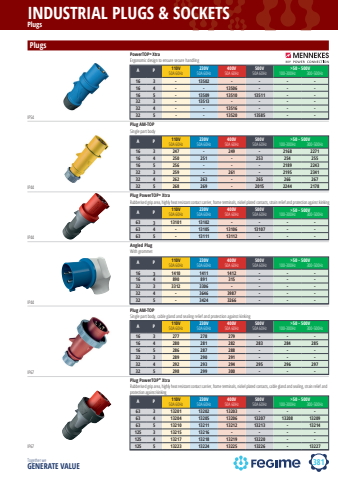 381INDUSTRIAL PLUGS & SOCKETSTogether we GENERATE VALUEPlugsIP44Plug PowerTOP%u00ae XtraRubberised grip area, highly heat resistant contact carrier, frame terminals, nickel plated contacts, strain relief and protection against kinkingPlug AM-TOPSingle part bodyA P 110V50A 60Hz 230V50A 60Hz 400V50A 60Hz 500V50A 60Hz 100-300Hz 300-500Hz16 3 247 - 249 - 2168 227116 4 250 251 - 253 254 25516 5 256 - - - 2189 224332 3 259 - 261 - 2195 234132 4 262 263 - 265 266 26732 5 268 269 - 2015 2244 2178>50 - 500VPlugsIP44IP44IP67Plug AM-TOPSingle part body, cable gland and sealing relief and protection against kinkingA P 110V50A 60Hz 230V50A 60Hz 400V50A 60Hz 500V50A 60Hz 100-300Hz 300-500Hz16 3 277 278 279 - - -16 4 280 281 282 283 284 28516 5 286 287 288 - - -32 3 289 290 291 - - -32 4 292 293 294 295 296 29732 5 298 299 300 - - ->50 - 500VA P 110V50A 60Hz 230V50A 60Hz 400V50A 60Hz 500V50A 60Hz 100-300Hz 300-500Hz63 3 13101 13102 - - - -63 4 - 13105 13106 13107 - -63 5 - 13111 13112 - - ->50 - 500VAngled PlugWith grommetA P 110V50A 60Hz 230V50A 60Hz 400V50A 60Hz 500V50A 60Hz 100-300Hz 300-500Hz16 3 1410 1411 1412 - - -16 4 890 891 315 - - -32 3 3312 3306 - - - -32 4 - 3646 3987 - - -32 5 - 3424 3266 - - ->50 - 500VIP67Plug PowerTOP%u00ae XtraRubberised grip area, highly heat resistant contact carrier, frame terminals, nickel plated contacts, cable gland and sealing, strain relief and protection against kinkingA P 110V50A 60Hz 230V50A 60Hz 400V50A 60Hz 500V50A 60Hz 100-300Hz 300-500Hz63 3 13201 13202 13203 - - -63 4 13204 13205 13206 13207 13208 1320963 5 13210 13211 13212 13213 - 13214125 3 13215 13216 - - - -125 4 13217 13218 13219 13220 - -125 5 13223 13224 13225 13226 - 13227>50 - 500VIP54PowerTOP%u00ae XtraErgonomic design to ensure secure handlingA P 110V50A 60Hz 230V50A 60Hz 400V50A 60Hz 500V50A 60Hz 100-300Hz 300-500Hz16 3 - 13502 - - - -16 4 - - 13506 - - -16 5 - 13509 13510 13511 - -32 3 - 13513 - - - -32 4 - - 13516 - - -32 5 - - 13520 13585 - ->50 - 500V