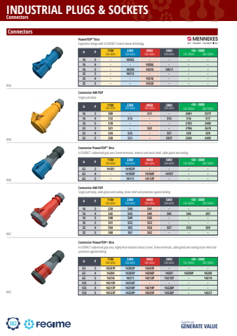 382INDUSTRIAL PLUGS & SOCKETSTogether we GENERATE VALUEConnectorsIP44A P 110V50A 60Hz 230V50A 60Hz 400V50A 60Hz 500V50A 60Hz 100-300Hz 300-500Hz16 3 509 - 511 - 2441 251716 4 512 513 - 515 516 51716 5 518 - - - 2193 249532 3 521 - 523 - 2196 267432 4 524 525 - 527 528 52932 5 530 531 - 2027 2245 2493>50 - 500VConnectorsIP44A P 110V50A 60Hz 230V50A 60Hz 400V50A 60Hz 500V50A 60Hz 100-300Hz 300-500Hz63 3 14101 14102P - - - -63 4 - 14105P 14106P 14107 - -63 5 - 14111 14112P - - ->50 - 500VIP67A P 110V50A 60Hz 230V50A 60Hz 400V50A 60Hz 500V50A 60Hz 100-300Hz 300-500Hz16 3 539 540 541 - - -16 4 542 543 544 545 546 54716 5 548 549 550 - - -32 3 551 552 553 - - -32 4 554 555 556 557 558 55932 5 560 561 562 - - ->50 - 500VIP67A P 110V50A 60Hz 230V50A 60Hz 400V50A 60Hz 500V50A 60Hz 100-300Hz 300-500Hz63 3 14201P 14202P 14203P - - -63 4 14204 14205P 14206P 14207 14208P 1420963 5 14210 14211 14212P 14213P - 14214125 3 14215P 14216P - - - -125 4 14217P 14218P 14219P 14220P - -125 5 14223P 14224P 14225P 14226P - 14227>50 - 500VConnector AM-TOPSingle part bodyConnector PowerTOP%u00ae XtraX-CONTACT, rubberised grip area, frame terminals, contacts and strain relief, cable gland and sealingConnector AM-TOPSingle part body, cable gland and sealing, strain relief and protection against kinkingConnector PowerTOP%u00ae XtraX-CONTACT rubberised grip area, highly heat resistant contact carrier, frame terminals, cable gland and sealing strain relief and protection against kinkingPowerTOP%u00ae XtraErgonomic design with X-CONTACT contact sleeve technologyA P 110V50A 60Hz 230V50A 60Hz 400V50A 60Hz 500V50A 60Hz 100-300Hz 300-500Hz16 3 - 14502 - - - -16 4 - - 14506 - - -16 5 - 14509 14510 14511 - -32 3 - 14513 - - - -32 4 - - 14516 - - -32 5 - - 14520 - - ->50 - 500VIP54