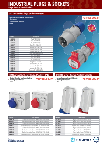 383INDUSTRIAL PLUGS & SOCKETSTogether we GENERATE VALUEscameOPTIMA Series Plugs and ConnectorsPlugs, Connectors & SocketsPart No. Description213.1630 Plug 2P+E 16A 110V 213.1633 Plug 2P+E 16A 240V 213.1636 Plug 3P+E 16A 415V 213.1637 Plug 3P+N+E 16A 415V 313.1640 Connector 2P+E 16A 110V 313.1643 Connector 2P+E 16A 240V 313.1646 Connector 3P+E 16A 415V 313.1647 Connector 3P+N+E 16A 415V 213.3230 Plug 2P+E 32A 110V 213.3233 Plug 2P+E 32A 240V 213.3236 Plug 3P+E 32A 415V 213.3237 Plug 3P+N+E 32A 415V 313.3240 Connector 2P+E 32A 110V 313.3243 Connector 2P+E 32A 240V 313.3246 Connector 3P+E 32A 415V 313.3247 Connector 3P+N+E 32A 415V %u2022 Portable Industrial Plugs And Connectors%u2022 Fast wiring%u2022 Thermoplastic Material%u2022 IP44OPTIMA Series Angled Surface Sockets%u2022 Surface Mounting Industrial Sockets%u2022 Thermoplastic Material%u2022 IP44Part No. Description513.1650 Angled Surface Socket 2P+E 16A 110V 513.1653 Angled Surface Socket 2P+E 16A 240V 513.1656 Angled Surface Socket 3P+E 16A 415V513.1657 Angled Surface Socket 3P+N+E 16A 415V513.3250 Angled Surface Socket 2P+E 32A 110V513.3253 Angled Surface Socket 2P+E 32A 240V513.3256 Angled Surface Socket 3P+E 32A 415V513.3257 Angled Surface Socket 3P+N+E 32A 415V BESTSELLERSOMNIA Switched-Interlocked Sockets IP44Part No. Description500.1670 Switched-Interlocked Socket OMNIA 16A 110V 2P+E IP44500.1683 Switched-Interlocked Socket OMNIA 16A 240V 2P+E IP44500.1686 Switched-Interlocked Socket OMNIA 16A 415V 3P+E IP44500.1687 Switched-Interlocked Socket OMNIA 16A 415V 3P+N+E IP44500.3270 Switched-Interlocked Socket OMNIA 32A 110V 2P+E IP44500.3283 Switched-Interlocked Socket OMNIA 32A 240V 2P+E IP44500.3286 Switched-Interlocked Socket OMNIA 32A 415V 3P+E IP44500.3287 Switched-Interlocked Socket OMNIA 32A 415V 3P+N+E IP44%u2022 Surface Mounting Interlocked Sockets%u2022 Thermoplastic Material%u2022 IP44