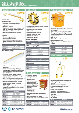 386SITE LIGHTINGTogether we GENERATE VALUE%u2022 %u2018On and Off%u2019 switching allowing to isolate the device from the mains when not in use%u2022 110V working indicator shows whether the transformer is in use or switched off, providing visual confirmation for end users%u2022 Suitable for power distribution on construction sites%u2022 High quality metal casing with heavy duty stand %u2022 MCB protected input and output%u2022 Supplied with 4x16A outlets and 2x32A outletsbriticentNon-Corrosive Fittings, Festoon Kits & TransformersFestoon KitsPart No. DescriptionSEFLLEDBC 10 x 8W B22 4000K IP44 22mFestoon Lighting Kits%u2022 Suitable temporary lighting solution for indoor and outdoor use%u2022 Complete 22m kit with 10 lamps%u2022 2.5mm cable%u2022 Lampholders spaced every 2m%u2022 Available with LED GLS lamps%u2022 Available as B22 or E27%u2022 Supplied with 16A plugPart No. DescriptionSEPC Festoon polycarbonate guardPart No. DescriptionSEFLKITBC B22 IP44 22mSEFLKITES E27 IP44 22mSEFL13B B22 IP44 100mSEFL13E E27 IP44 100mLED Festoon Lighting CablesAccessoriesNon-Corrosive FittingsLinkable Non Corrosive Fittings%u2022 Suitable for industrial and commercial applications%u2022 Available in 2ft option%u2022 Supplied with 1.0m pre wired leads with 110V male and female plugs for quick installation%u2022 Daisy chain up to 20 battens in series%u2022 Wide voltage range 100-240V / 50-60HzEmergency%u2022 3 hours emergency function%u2022 Pre-wired with 3-Core cable%u2022 LiFePO4 lithium battery provides improved energy consumption,product reliability and lifetimePart No. DescriptionBI3112 2ft 27W 6500K IP65BI3112E 2ft 27W 6500K IP65 EMNon Corrosive Fittings%u2022 LED non-corrosive luminaire for site applications%u2022 Lumen output and wattage efficiency of 135lm per watt, requiring less power than the previous range while maintaining the same level of brightness%u2022 2FT and 5FT options, 24-36W, 3240lm to 4,860lm, 6500K (daylight), 120%u00b0 beam angle, IP65, 100-240V%u2022 Built in low voltage protection device to cope in environments where voltage may fluctuate%u2022 Wide voltage range of 100-240V / 50-60Hz%u2022 3-hour emergency duration with LiFeP04 battery options%u2022 IP65 rating for total protection against dust and low-pressure jets of water from any direction%u2022 2-year guaranteePart No. DescriptionBI4117 2ft 24W 6500K IP65BI4125 5ft 36W 6500K IP65BI4118 2ft 24W 6500K IP65 EMBI4126 5ft 36W 6500K IP65 EMBI4119 2ft 24W 6500K IP65 + Plexo BoxBI4127 5ft 36W 6500K IP65 + Plexo BoxBI4120 2ft 24W 6500K IP65 EM + Plexo BoxBI4128 5ft 36W 6500K IP65 EM + Plexo BoxPortable Transformers - 110V Part No. Description1000/2/B 1kVA portable1500/2/B 1.5kVA portable3000/2/B 3kVA portable5000/3/B 5kVA portable%u2022 Suitable for all applications where power needs to be reduced%u2022 3kVA portable transformer bracket included for output socket protection. Ergonomic design allows smooth lifting of socket covers without any obstructions%u2022 230V to 110V%u2022 Robust GRP case with carry handle%u2022 Resettable thermal cutout%u2022 Supplied with 1.5m cable (5000/3/B - 2m) and 13A plug Transformers - 110V Part No. Description10000/1PH 10kVA Single Phase Trans 230V Input10000/3PH 10kVA Three Phase Trans 415V InputPower Festoon - 110V Part No. DescriptionBI2112 100M 10x16A Single Drop Power FestoonBI2121 100M 19x16A Dual Drop Power FestoonPR1005L 100M 20x16A Single Drop Power Festoon%u2022 Power distribution solution for site electrics%u2022 100m length with power drops at 10m or 5m intervals%u2022 Single or dual power drop options%u2022 1m drop cable length with 16A coupler%u2022 2.5mm 3 core main cable%u2022 1.5mm 3 core cable drops%u2022 Suitable for indoor and outdoor use%u2022 Rewireable, weatherproof junction boxes%u2022 IP44 rating%u2022 1-year guarantee%u2022 BS EN 60309Part No. DescriptionR1010 LED 8W E27 4000KR1020 LED 8W B22 4000KLED GLS Lamps
