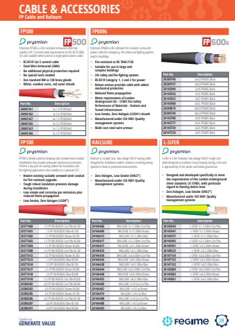 39CABLE & ACCESSORIESTogether we GENERATE VALUEdrakaRAILSURE%u2022 Zero Halogen, Low Smoke (OHLS%u00ae)%u2022 Manufactured under ISO 9001 Quality management systemsRailsure is a single core, low voltage OHLS%u00ae wiring cable designed for installation within conduit or trunking wiring systems in fi xed or protected environments.L-SIFER%u2022 Designed and developed specifically to meet the requirements of the London Underground client standard, LU S1085, with particular regard to flaming debris tests %u2022 Zero Halogen, Low Smoke (OHLS%u00ae)%u2022 Manufactured under ISO 9001 Quality management systemsL-Sifer is a fi re resistant, low voltage OHLS%u00ae single core cable designed to maintain circuit integrity during a fi re and is%u00a0approved by LU for above and below ground use.FP100%u2022 Rewire existing suitable screwed steel conduit for fire resistant upgrade.%u2022 Tough robust insulation prevents damage during installation%u2022 Low smoke and corrosive gas emissions plus reduced flame propagation%u2022 Low Smoke, Zero Halogen (LSOH%u00ae)FP100 is ideally suited to drawing into screwed steel conduit installations that provide adequate mechanical protection. It forms a key part of a wiring system for evacuation and fi re-fi ghting applications also suitable as a separate CPC.FP Cable and RailsurePart No. Description20146406 RAILSURE 1x1.5 200m Grn/Ylw20146409 RAILSURE 1x1.5 200m Brown20146413 RAILSURE 1x1.5 200m Blue20146417 RAILSURE 1x2.5 200m Grn/Ylw20146421 RAILSURE 1x2.5 200m Brown20146425 RAILSURE 1x2.5 200m Blue20146430 RAILSURE 1x4.0 200m Grn/Ylw20146434 RAILSURE 1x4.0 200m Brown20146438 RAILSURE 1x4.0 200m Blue20146444 RAILSURE 1x6.0 200m Grn/Ylw20146448 RAILSURE 1x6.0 200m Brown20146453 RAILSURE 1x6.0 200m Blue20146460 RAILSURE 1x10 Cut Grn/Ylw20146467 RAILSURE 1x10 Cut Brown20146474 RAILSURE 1x10 Cut Blue20146480 RAILSURE 1x16 Cut Grn/Ylw20146488 RAILSURE 1x16 Cut Brown20146493 RAILSURE 1x16 Cut BluePart No. Description20145945 L-SIFER 1x1.5 200m Grn/Ylw20145941 L-SIFER 1x1.5 200m Brown20145937 L-SIFER 1x1.5 200m Blue20145905 L-SIFER 1x2.5 200m Grn/Ylw20145901 L-SIFER 1x2.5 200m Brown20148522 L-SIFER 1x2.5 200m Blue20147154 L-SIFER 1x4.0 200m Grn/Ylw20147153 L-SIFER 1x4.0 200m Brown20147152 L-SIFER 1x4.0 200m Blue20145869 L-SIFER 1x6.0 200m Grn/Ylw20145865 L-SIFER 1x6.0 200m Brown20145861 L-SIFER 1x6.0 200m BluePart No. Description20377460 1.5 FP100 BS8592 Grn/Ylw RL10020377601 1.5 FP100 BS8592 Blue RL10020377602 1.5 FP100 BS8592 Brown RL10020377603 1.5 FP100 BS8592 Grn/Ylw RL50020377604 1.5 FP100 BS8592 Brown RL50020377608 2.5 FP100 BS8592 Grn/Ylw RL10020377612 2.5 FP100 BS8592 Brown RL10020377613 1.5 FP100 BS8592 Blue RL50020377614 2.5 FP100 BS8592 Blue RL10020377617 2.5 FP100 BS8592 Brown RL50020377618 2.5 FP100 BS8592 Blue RL50020377619 2.5 FP100 BS8592 Grn/Ylw RL50020380282 4.0 FP100 BS8592 Grn/Ylw RL50020380283 4.0 FP100 BS8592 Brown RL50020380285 4.0 FP100 BS8592 Brown RL10020380286 4.0 FP100 BS8592 Grn/Ylw RL10020380287 4.0 FP100 BS8592 Blue RL10020380291 4.0 FP100 BS8592 Blue RL500%u2022 BS 8519 Cat 3 control cable%u2022 Steel Wire Armoured (SWA)%u2022 No additional physical protection required%u2022 No special tools needed%u2022 Use standard BW or CW brass glands%u2022 White, number cores, red outer sheathPrysmian FP500 is a fi re resistant armoured cable that satisfi es CAT 3 Control cable requirements for BS 8519:2020. It is also suitable when used as a single phase power cable. FP500Part No. Description20405161 3x 1.5 FP500 Red20405162 3x 2.5 FP500 Red20405167 4x 1.5 FP500 Red20405165 4x 2.5 FP500 Red20405163 5x 1.5 FP500 Red20405166 5x 2.5 FP500 Red%u2022 Fire resistant to BS 7846 F120%u2022 Suitable for use in large and complex buildings%u2022 Life safety and fire-fighting systems%u2022 BS 8519 Category 1, 2 and 3 for power%u2022 Robust armour provides cable with added mechanical protection%u2022 Reduced flame propagation%u2022 Meets requirements of London Underground LUL - S1085 Fire Safety Performance of Materials - Stations and Tunnel Infrastructure%u2022 Low Smoke, Zero Halogen (LSOH%u00ae) sheath%u2022 Manufactured under ISO 9001 Quality management systems%u2022 Multi core steel wire armourPrysmian FP600s is the ultimate fi re resistant, armoured power cable for emergency, life safety and fi ghting systems used in buildingsFP600sPart No. Description20389748 3x4.0 FP600S Black20389747 3x6.0 FP600S Black20145949 3x10 FP600S Black20145936 3x16 FP600S Black20145923 3x25 FP600S Black20145908 3x35 FP600S Black20389819 4x4.0 FP600S Black20389749 4x6.0 FP600S Black20145788 4x10 FP600S Black20145777 4x16 FP600S Black20145754 4x25 FP600S Black20147724 4x35 FP600S Black
