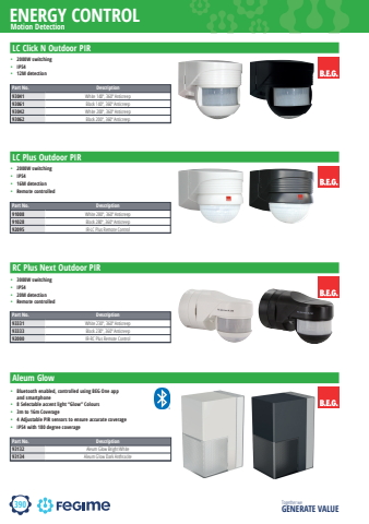 390ENERGY CONTROLTogether we GENERATE VALUEMotion DetectionLC Plus Outdoor PIR%u2022 2000W switching%u2022 IP54%u2022 16M detection %u2022 Remote controlledPart No. Description91008 White 280o, 360o Anticreep91028 Black 280o, 360o Anticreep92095 IR-LC Plus Remote ControlLC Click N Outdoor PIR%u2022 2000W switching%u2022 IP54%u2022 12M detectionPart No. Description93041 White 140o, 360o Anticreep93061 Black 140o, 360o Anticreep93042 White 200o, 360o Anticreep93062 Black 200o, 360o AnticreepRC Plus Next Outdoor PIRAleum Glow%u2022 3000W switching%u2022 IP54%u2022 20M detection%u2022 Remote controlled%u2022 Bluetooth enabled, controlled using BEG One app and smartphone%u2022 8 Selectable accent light %u201cGlow%u201d Colours%u2022 3m to 16m Coverage%u2022 4 Adjustable PIR sensors to ensure accurate coverage%u2022 IP54 with 180 degree coveragePart No. Description93331 White 230o, 360o Anticreep93333 Black 230o, 360o Anticreep92000 IR-RC Plus Remote ControlPart No. Description93132 Aleum Glow Bright White 93134 Aleum Glow Dark Anthracite