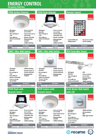 391ENERGY CONTROLTogether we GENERATE VALUEPD3N Surface Detector%u2022 360 degree detection %u2022 10m coverage at 2.5m%u2022 10 to 2000 Lux switch on threshold%u2022 IP44 %u2022 30 sec to 30 min run on timer%u2022 Snap in base unit to ease wiring%u2022 Remote controlled %u2022 Blanking blinds included%u2022 2300W switchingPart No. Description92190 PD3N SurfacePD3N Flush Detector%u2022 360 degree detection %u2022 10m coverage at 2.5m%u2022 10 to 2000 Lux switch on threshold%u2022 IP23 %u2022 30 sec to 30 min run on timer%u2022 Controls behind removable cover%u2022 Remote controlled %u2022 Blanking blinds included %u2022 2300W switchingPart No. Description92196 PD3N FlushRemote Control%u2022 Control PD3N and PD4N products%u2022 Set up run on times and lux settingsPart No. Description92105 Remote Control for PD3N Products180R 3 Wire Wall Switch%u2022 180 degree detection %u2022 8m coverage at 2.5m%u2022 40 to 2000 Lux switch on threshold %u2022 15 sec to 16 min run on timer%u2022 2300W switching %u2022 Acoustic sensor to increase detection%u2022 Blanking blinds includedPart No. Description92610 180R 3 Wire Wall Switch180R 2 Wire Wall Switch%u2022 180 degree detection %u2022 8m coverage at 2.5m%u2022 40 to 2000 Lux switch on threshold 15 sec to 16 min run on timer%u2022 2300W switching %u2022 Acoustic sensor to increase detection%u2022 Blanking blinds includedPart No. Description92716 180R 2 Wire (No Neutral) Wall SwitchPD9 Flush-Mini Sensor%u2022 360 degree detection %u2022 10m coverage at 2.5m%u2022 10 to 2000 Lux switch on threshold%u2022 IP20 %u2022 30 sec to 30 min run on timer%u2022 Blanking blinds included%u2022 1000W switchingPart No. Description92902 PD9 Flush-Mini Discrete Sensor%u2022 Acoustic sensor %u2022 360 degree detection %u2022 10m coverage at 2.5m%u2022 10 to 2000 Lux switch on threshold%u2022 IP23 %u2022 30 sec to 30 min run on timer%u2022 Controls behind removable cover%u2022 Blanking blinds included%u2022 2300W switchingPart No. Description92184 PD3N Flush with Acoustic Sensor%u2022 Acoustic Sensor %u2022 360 degree detection %u2022 10m coverage at 2.5m%u2022 10 to 2000 Lux switch on threshold%u2022 IP44 %u2022 30 sec to 30 min run on timer%u2022 Snap in base unit to ease wiring%u2022 Blanking blinds included%u2022 2300W switchingPart No. Description92219 PD3N Surface with Acoustic Sensor%u2022 120 degree detection %u2022 8m coverage at 2.5m%u2022 10 to 2000 Lux switch on threshold %u2022 15 sec to 30 min run on timer%u2022 2000W switching %u2022 LED orientation light%u2022 Night light functionPart No. Description94327 Push Button Wall Switch with LEDOccupancy DetectionPD3N Flush with Acoustic SensorPD3N Surface with Acoustic SensorPush Button Wall Switch with LED