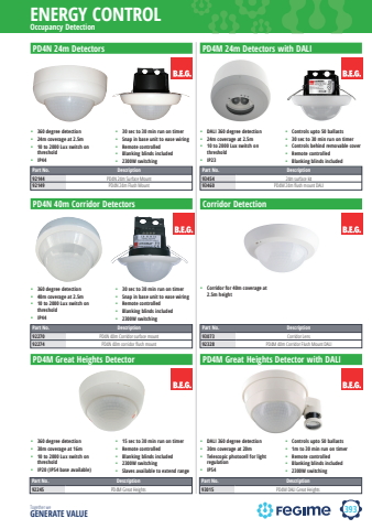 393ENERGY CONTROLTogether we GENERATE VALUEPD4N 24m Detectors%u2022 360 degree detection %u2022 24m coverage at 2.5m%u2022 10 to 2000 Lux switch on threshold%u2022 IP44%u2022 30 sec to 30 min run on timer%u2022 Snap in base unit to ease wiring%u2022 Remote controlled%u2022 Blanking blinds included%u2022 2300W switchingPD4M 24m Detectors with DALI%u2022 DALI 360 degree detection %u2022 24m coverage at 2.5m%u2022 10 to 2000 Lux switch on threshold%u2022 IP23%u2022 Controls upto 50 ballasts%u2022 30 sec to 30 min run on timer%u2022 Controls behind removable cover%u2022 Remote controlled%u2022 Blanking blinds includedPart No. Description93454 24m surface kit93460 PD4M%u000924m%u0009fl%u0009ush%u0009mount%u0009DALICorridor Detection%u2022 Corridor for 40m coverage at 2.5m heightPart No. Description93073 Corridor Lens92328 PD4M 40m Corridor Flush Mount DALIPart No. Description92144 PD4N 24m Surface Mount92149 PD4N 24m Flush MountOccupancy DetectionPD4M Great Heights Detector%u2022 360 degree detection %u2022 30m coverage at 16m%u2022 10 to 2000 Lux switch on threshold%u2022 IP20 (IP54 base available)%u2022 15 sec to 30 min run on timer%u2022 Remote controlled%u2022 Blanking blinds included%u2022 2300W switching%u2022 Slaves available to extend rangePD4M Great Heights Detector with DALI%u2022 DALI 360 degree detection %u2022 30m coverage at 20m%u2022 Telescopic photocell for light regulation%u2022 IP54%u2022 Controls upto 50 ballasts%u2022 1m to 30 min run on timer%u2022 Remote controlled%u2022 Blanking blinds included%u2022 2300W switchingPart No. Description92245 PD4M Great HeightsPart No. Description93015 PD4M DALI Great HeightsPD4N 40m Corridor Detectors%u2022 360 degree detection %u2022 40m coverage at 2.5m%u2022 10 to 2000 Lux switch on threshold%u2022 IP44%u2022 30 sec to 30 min run on timer%u2022 Snap in base unit to ease wiring%u2022 Remote controlled%u2022 Blanking blinds included%u2022 2300W switchingPart No. Description92270 PD4N 40m Corridor surface mount92274 PD4N%u000940m%u0009corridor%u0009fl%u0009ush%u0009mount