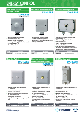 407ENERGY CONTROLTogether we GENERATE VALUESwitches & Push Buttons%u2022 Can be mounted on an exterior wall%u2022 Adjustable dusk to dawn photocell%u2022 Switches up to 4 amps (1000W) of fluorescent or 2 amps (500W) of LEDPart No. DescriptionTWSW Twilight switchPart No. DescriptionTLSW 10 Time lag switch, 2 wirePart No. DescriptionTLSW 10 ILM Time lag switch, 2 wire, illuminatedPart No. DescriptionGRTL MK Grid time lag switchPart No. DescriptionEXTLSW 16A Exterior time lag switch%u2022 Ideal for exterior heating or lighting loads%u2022 Adjustable time lag before switching off: 2 to 20 minutes%u2022 IP66 rated enclosure%u2022 3 wire - requires neutral connection%u2022 Illuminated push button area%u2022 Switches up to 16 amps (4000W) of quartz heaters, 12 amps (3000W) of fluorescent or 2 amps (500W) of most metal halide lampsIP66 Rated Photocell Switch Exterior Time Lag Switch%u2022 Adjustable time lag before switching off: 1 to 10 minutes%u2022 2 wire - no neutral wire needed%u2022 Fits onto a 16mm wall box%u2022 Switches up to 6 amps (1500W) of fluorescent or 2 amps (500W) of LED%u2022 Minimum load 40W resistive%u2022 Supplied with load capacitor to augment small loadsTime Lag Switch%u2022 Adjustable time lag before switching off: 1 to 10 minutes%u2022 2 wire - no neutral wire needed%u2022 Push button illuminates when load is off%u2022 Fits onto a 16mm wall box%u2022 Switches up to 6 amps (1500W) of fluorescent or 2 amps (500W) of LED%u2022 Minimum load 40W resistive%u2022 Supplied with load capacitor to augment small loadsTime Lag Switch With Illuminated Push Button%u2022 Adjustable time lag before switching off: 1 to 120 minutes%u2022 2 wire - no neutral wire needed%u2022 Suitable for MK Grid Plus%u2022 Requires 35mm deep wall box%u2022 Switches up to 6 amps (1500W) of fluorescent or 2 amps (500W) of LED%u2022 Minimum load 40W resistive%u2022 Supplied with load capacitor to augment small loadsGrid Time Lag SwitchIP66 Rated Person Detector SwitchPart No. DescriptionCOPIR IP66 IP66 rated person detector switch%u2022 Can be mounted on an exterior wall%u2022 Detection range up to 10m%u2022 Adjustable time lag and photocell%u2022 Switches up to 10 amps (2300W) of fluorescent or 6 amps (1500W) of LED%u2022 Also available in black